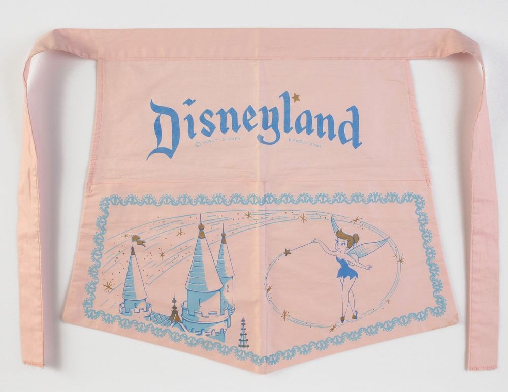 (Disneyland, 1960s) Small child's apron with two large pockets in the front. "Disneyland" reads along the top in large blue letters above imagery of Tinker Bell and Sleeping Beauty Castle. Measures 13.5"x15.5". In good condition with minimal wear.