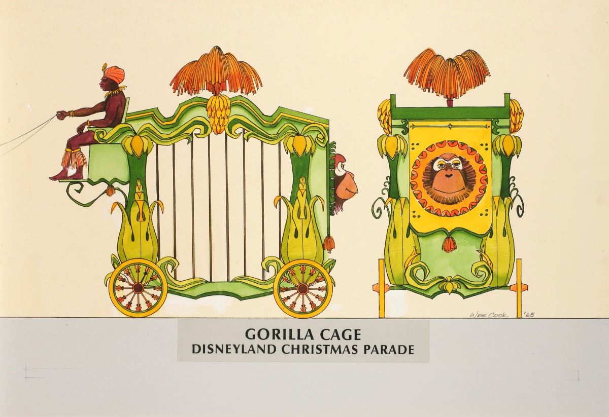 (Disneyland, 1965) Beautiful original float design by Imagineer Wes Cook. Known for his imaginative costume and parade designs during the 1960s and 1970s, this design by Cook features a gorilla cage, perhaps to a circus themed parade, and is signed and dated by the artist at the lower right. Accomplished in gouache and watercolor on 13.5"x19.5" artist's board. In good condition with some staining to board and mat.