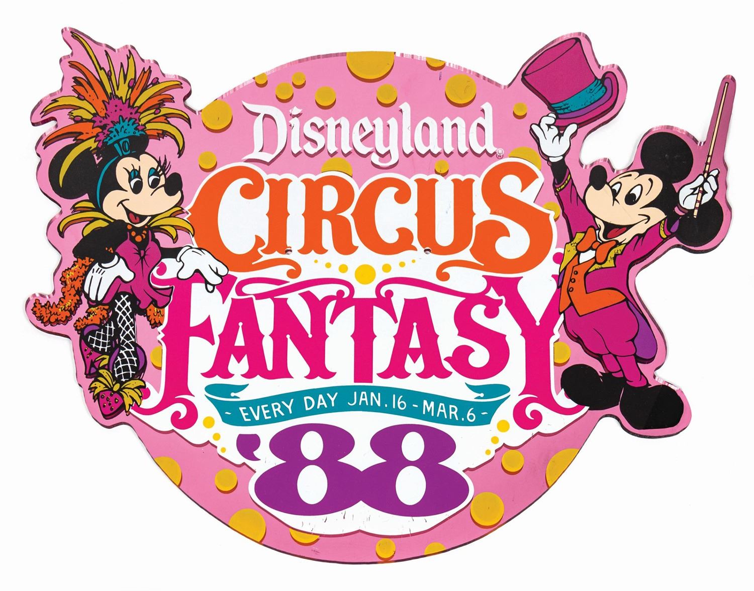 (Disneyland, 1988) A rare large Disneyland Circus Fantasy ’88 lamppost sign. Constructed of purple acrylic screen-printed with a large text logo over a polka dot field flanked by festive illustrations of Mickey and Minnie Mouse, the sign informs park goers of special events running daily from January 16 to March 6. The piece measures 25.5”x20.5” and is in very good condition. It is equipped with two holes at center for attachment to a lamppost and exhibits some rubbing and paint loss from park use.