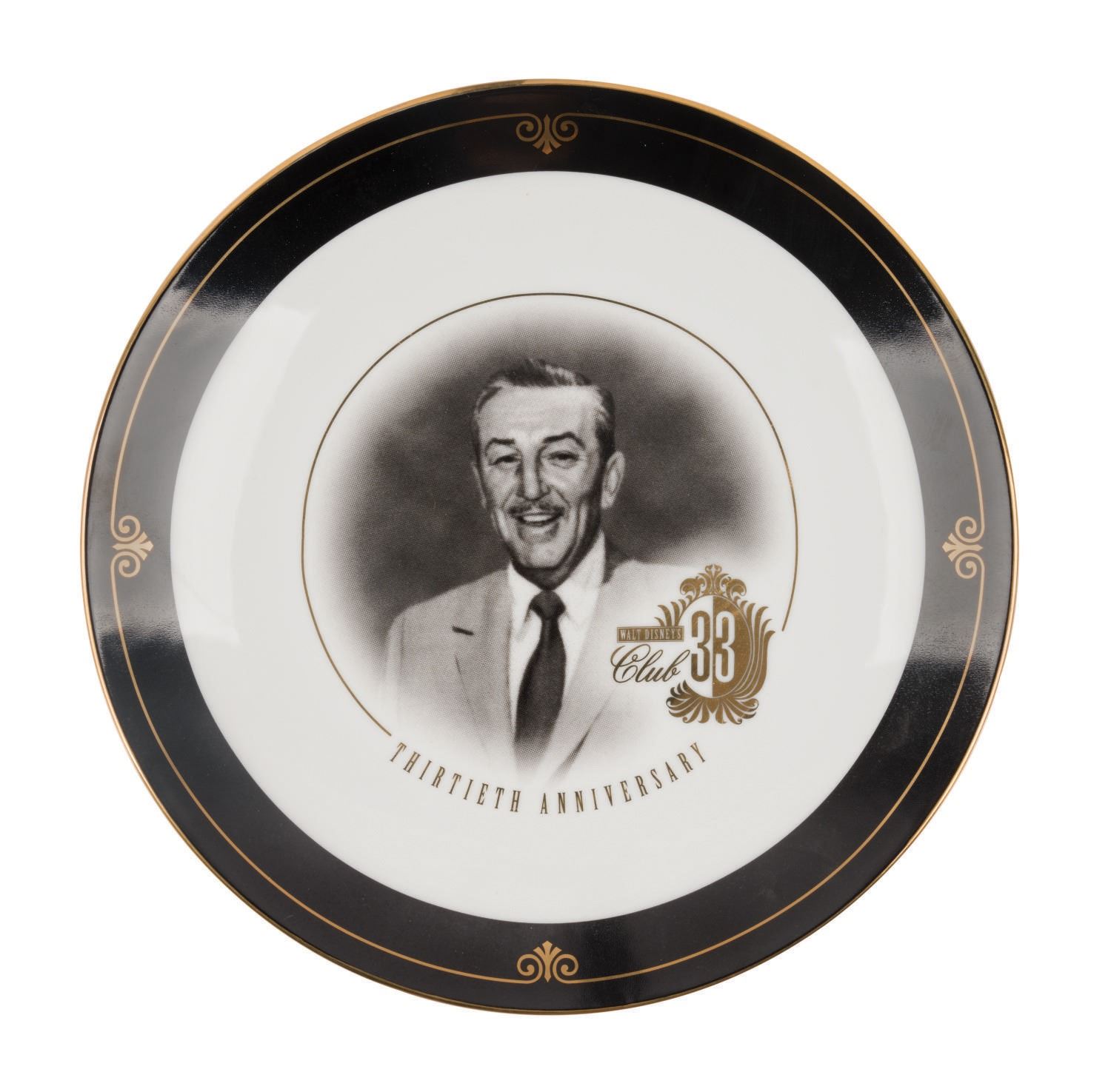 (Disneyland, 1997) A limited edition commemorative plate released in celebration of Club 33's 30th Anniversary. The kiln-fired porcelain plate features a black rim, a gold club logo and Art Deco trim, as well as a central portrait of Walt by master Disneyland illustrator Charles Boyer. Hand-numbered in gold ink on the reverse, "58/600," the plate measures 9.5" in diameter and is in fine condition.
