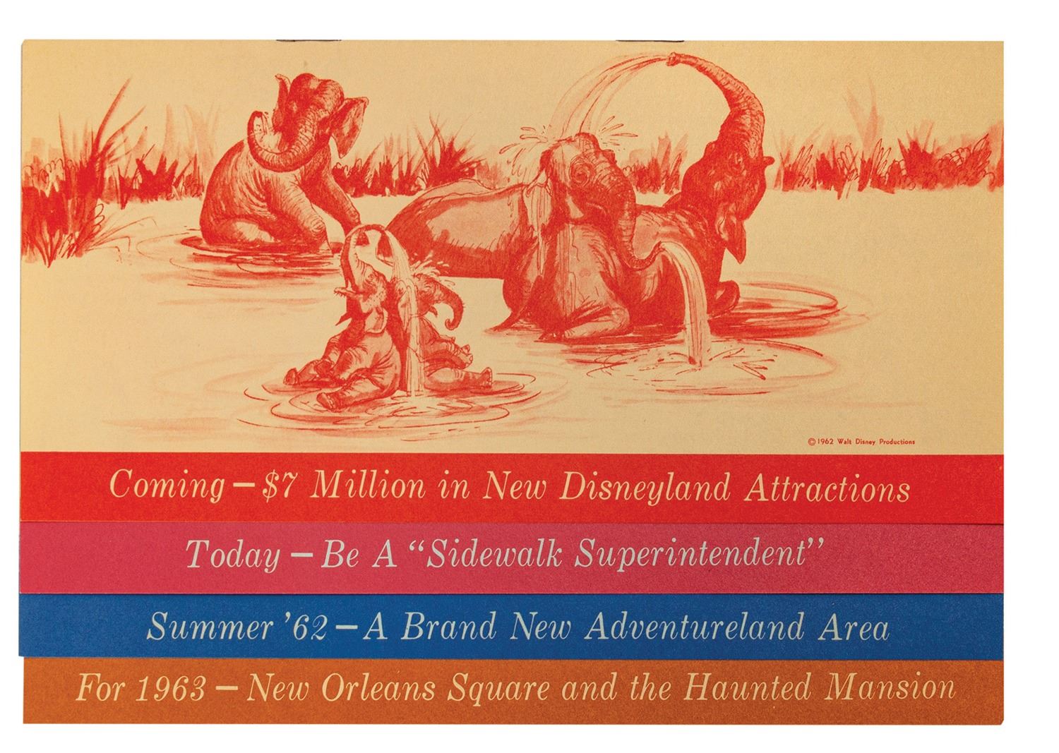 (Disneyland, 1962) A rare gate flyer used to promote the $7 million in new Disneyland attractions that were under construction in 1962. The flyer flips up in four sections to discuss the Swiss Family Treehouse, Haunted Mansion, and the new Adventureland area. Measuring 5"x7.5", the flyer is in very good condition.