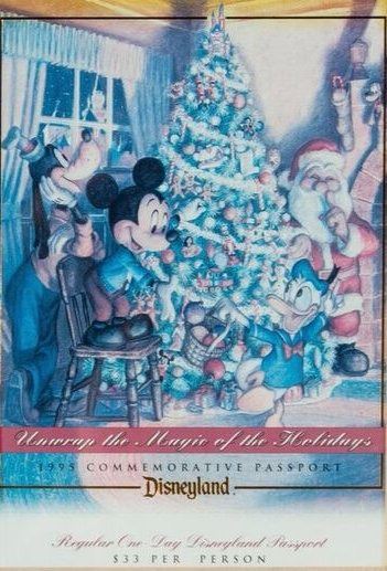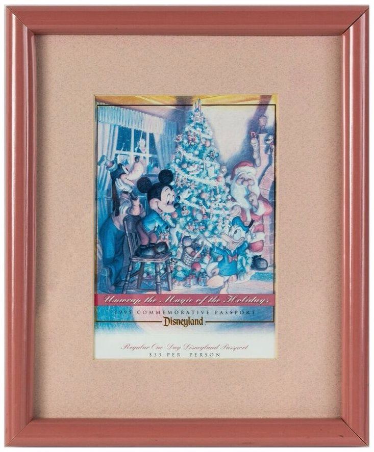 (Disneyland, 1995) A special commemorative passport created for the Holiday Season in 1995. This passport features Christmas imagery of Mickey, Donald, and Goofy, and reads "Unwrap the Magic of the Holidays". This item measures 11"x9" framed, and is in very good condition.