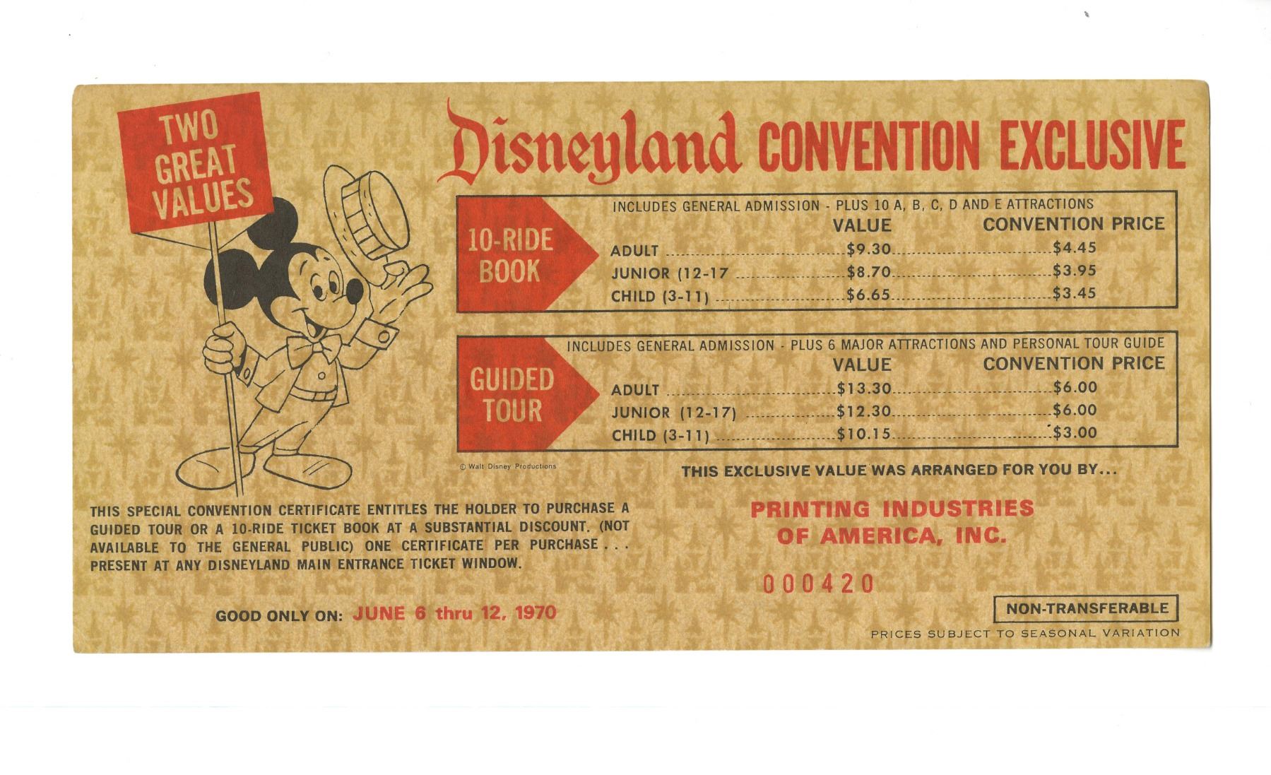 (Disneyland, 1970) A special ticket book certificate which allowed the holder to purchase a Disneyland guided tour or a 10-ride ticket book at a "substantial discount". The certificate is titled "Disneyland Convention Exclusive" and was issued in partnership with the Printing Industries of America, Inc. Next to the great image of Mickey Mouse are the discounted prices for ticket books and tours. Measuring 3.5"x7", the certificate is in very good condition. The certificate is marked as number 000420 on the subtle Disneyland Castle logo paper.