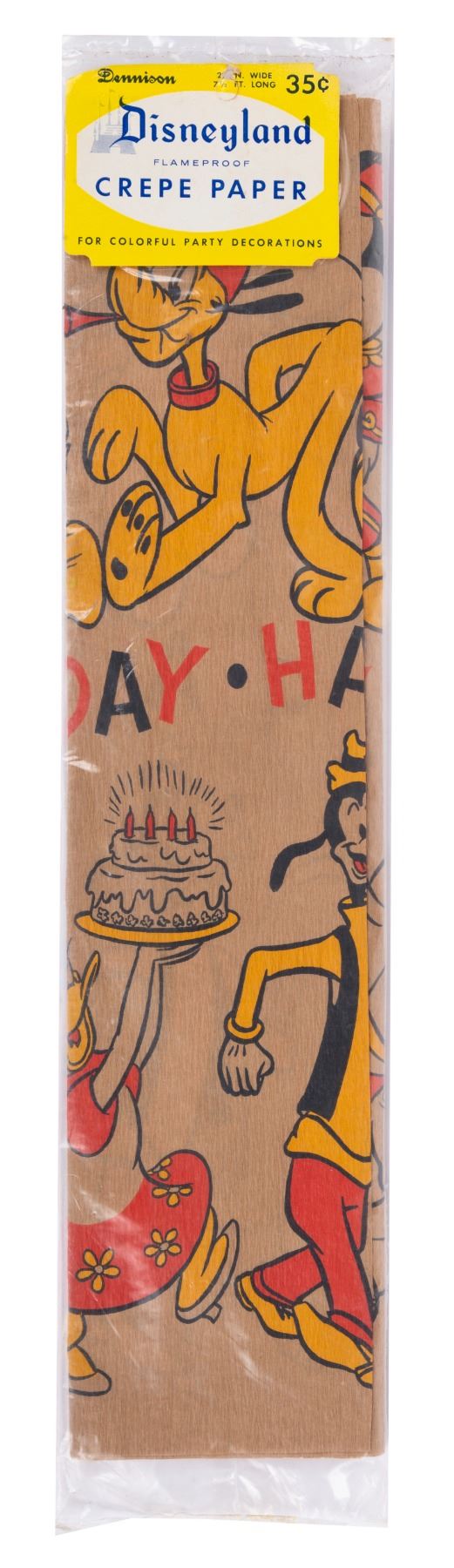 (Dennison, 1950s-60s) Original Disneyland Flameproof Crepe Paper featuring Goofy, Daisy, and Pluto. The 7 ½ foot long paper was intended for use as a colorful party decoration. Measuring 5" x 22", the original sealed package and product display in fine condition, exhibiting little wear.