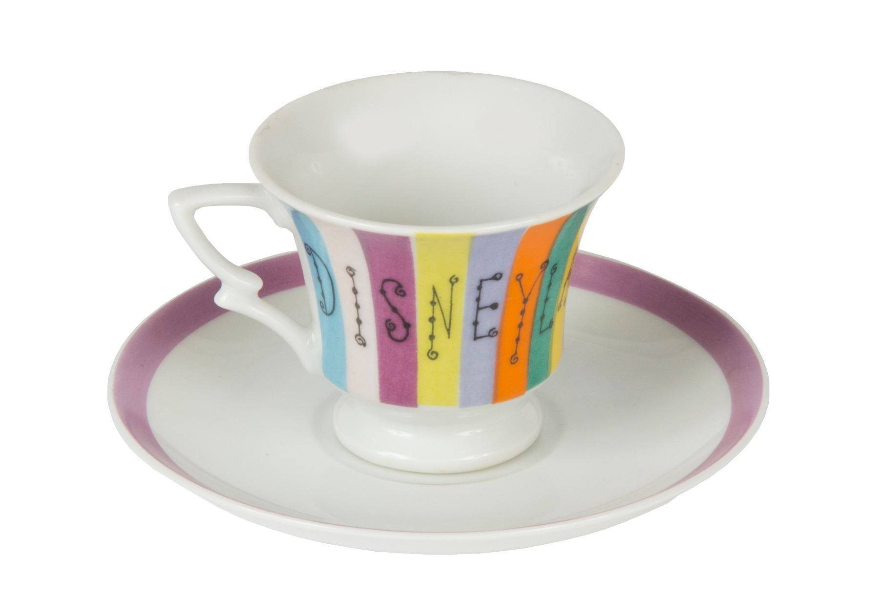 (Disneyland, c.1960s) A ceramic cup and saucer set from Disneyland featuring a stylish multicolored pattern with a wispy "Disneyland" font. The cup and saucer both have a green Disneyland logo on the bases. The cup measures 2.25" tall and the saucer measures 4.5" in diameter. The pair is in very good condition with minor wear.