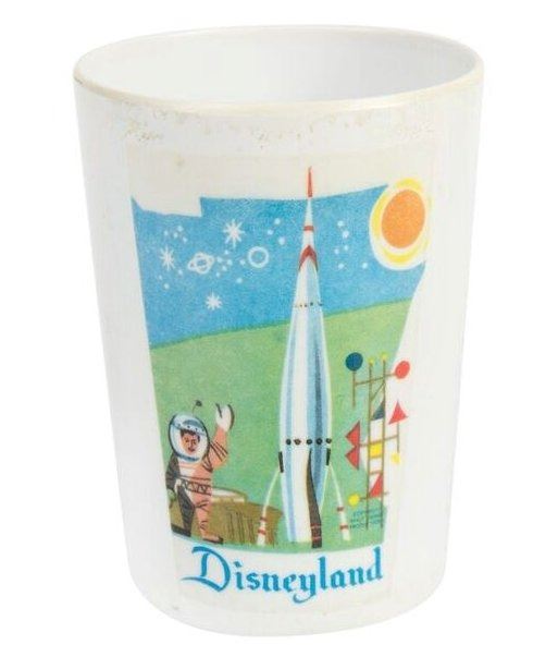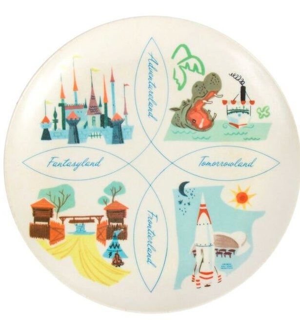 (Disneyland, c.1960) An early cup and plate set by Basdonware featuring imagery of the different lands of the park. The (2) plates show 4 of the 5 lands, while the (1) cup shows Tomorrowland. The items are advertised as "break resistant" melamine and the plates are two slightly different shapes produced in different runs. The plates measure approximately 7.5" in diameter and the cup measures 3.5" tall. The set is in fair condition with some wear and chipping.