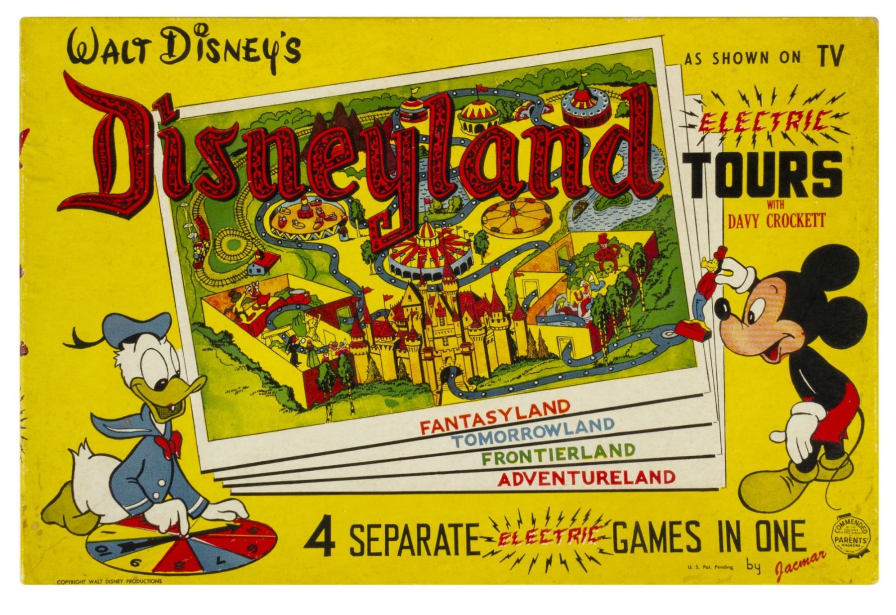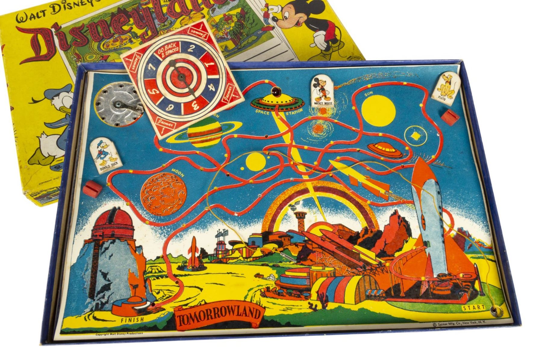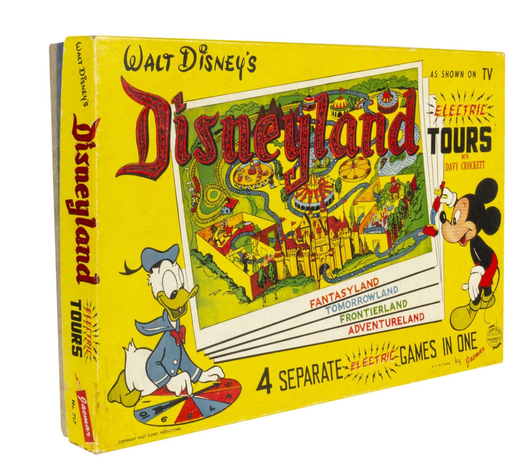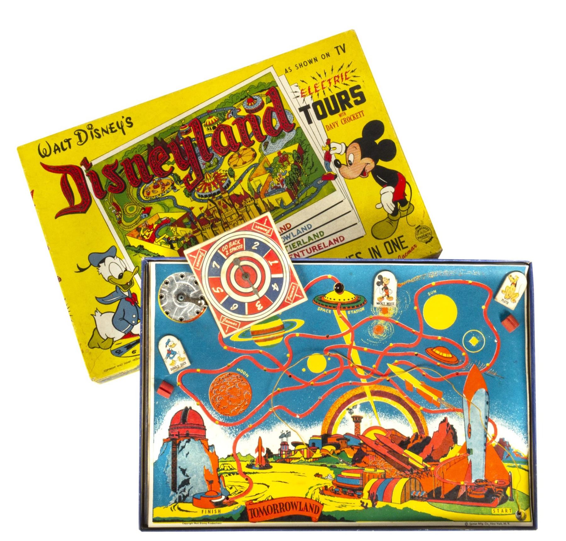 (Disneyland, c.1955) A vintage board game created by Jacmar with (4) game boards based on Disneyland's Fantasyland, Tomorrowland, Frontierland, and Adventureland. The game comes in its original box and contains: 4 game boards, 4 character pieces, 2 character stands, and one spinner. One character piece and 2 character stands are missing. Measuring 12.25"x18.25" and 2.25" tall, the game is in fair to good condition, with expected wear to the box from age and use, and some discoloration to the box. The functionality of the electrical components has not been tested.