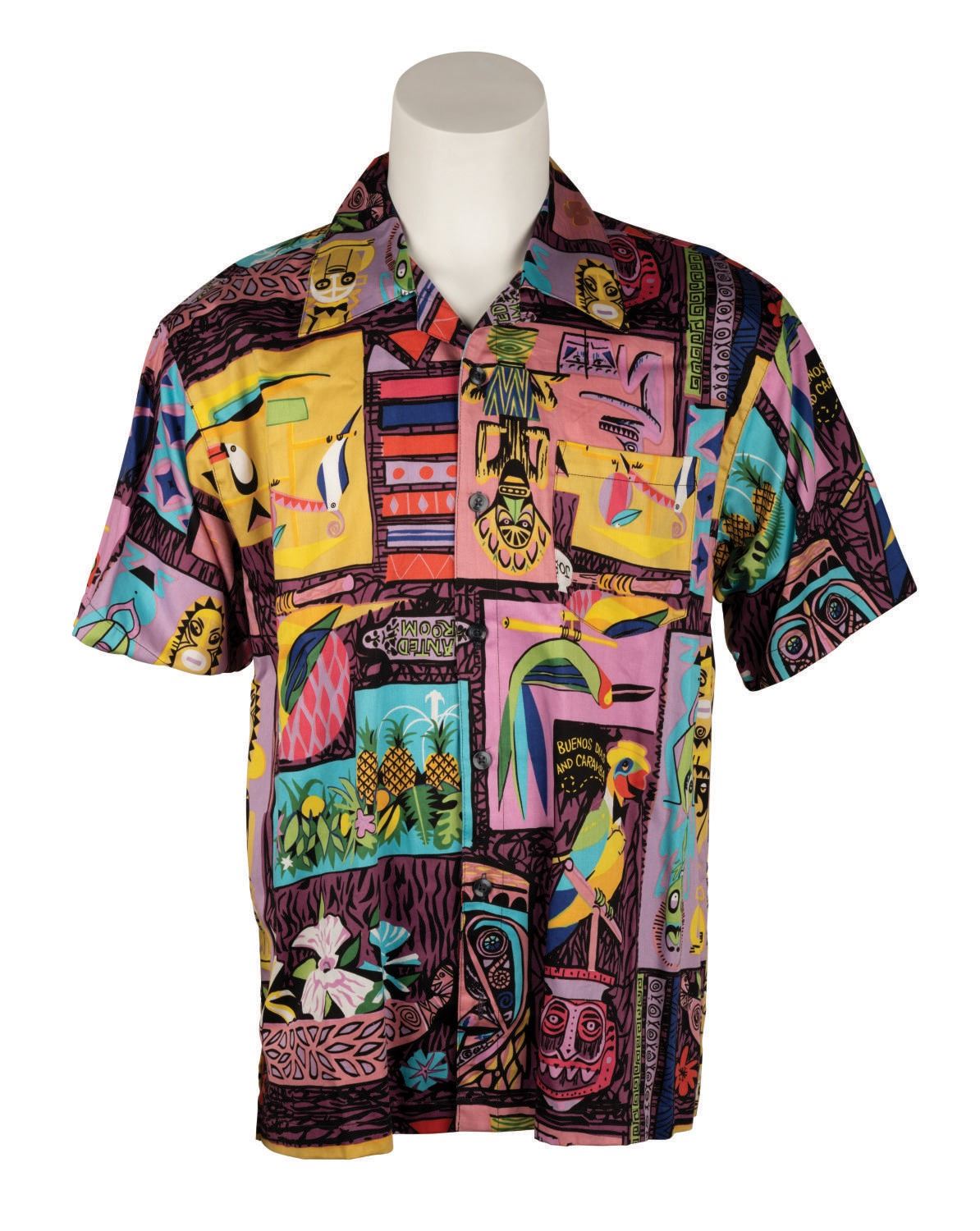 (Disneyland, 2003) A limited edition warm-toned shirt designed in the style of vintage "Enchanted Tiki Room" cast member wardrobe. Created for the 40th Anniversary of the attraction, this shirt features Tiki Room imagery throughout and was limited to an edition size of 500. The shirt is a men's size large and is in fine condition.