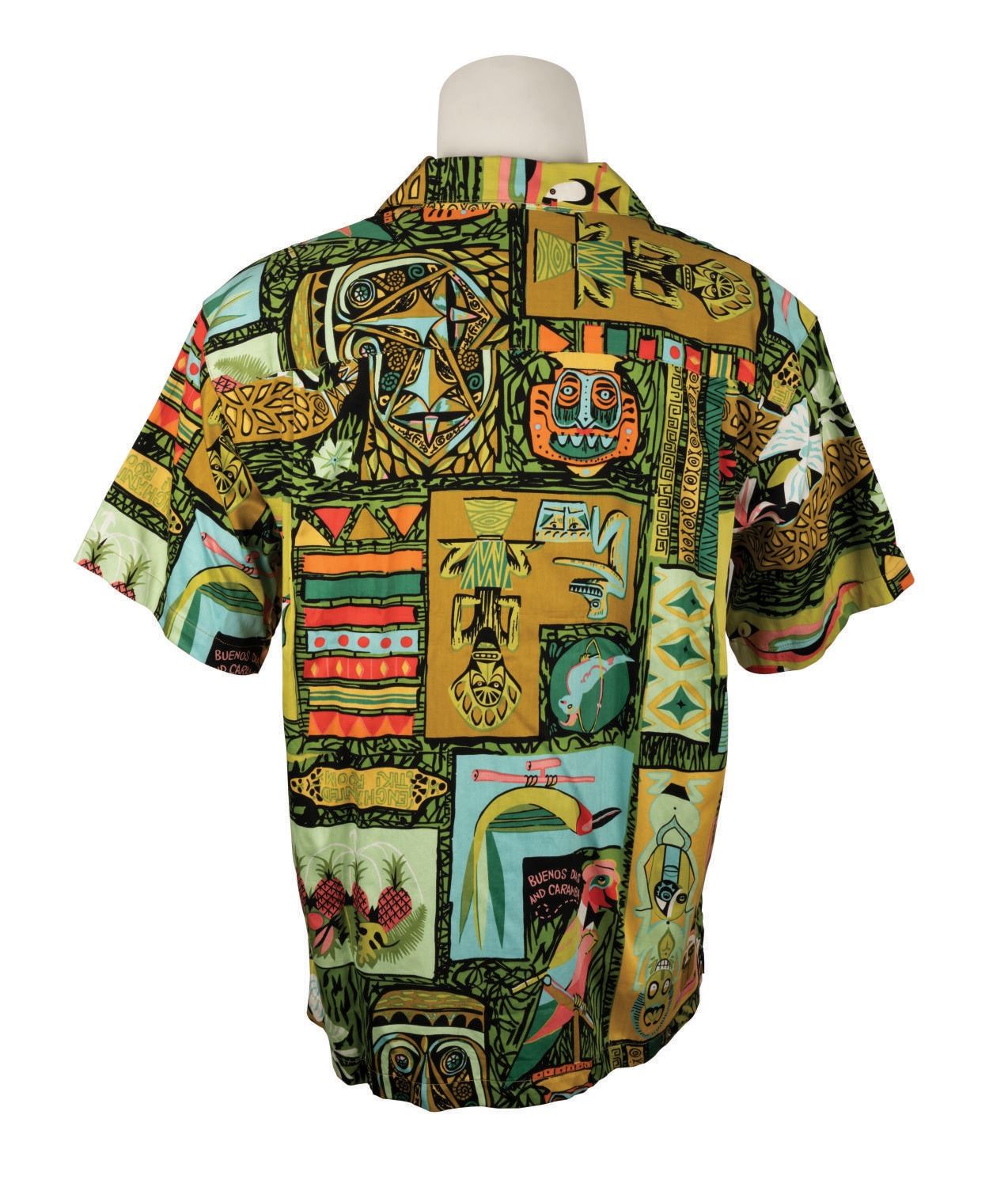 (Disneyland, 2003) A limited edition cool-toned shirt designed in the style of vintage "Enchanted Tiki Room" cast member wardrobe. Created for the 40th Anniversary of the attraction, this shirt features Tiki Room imagery throughout and was limited to an edition size of 500. The shirt is a men's size large and is in fine condition.
