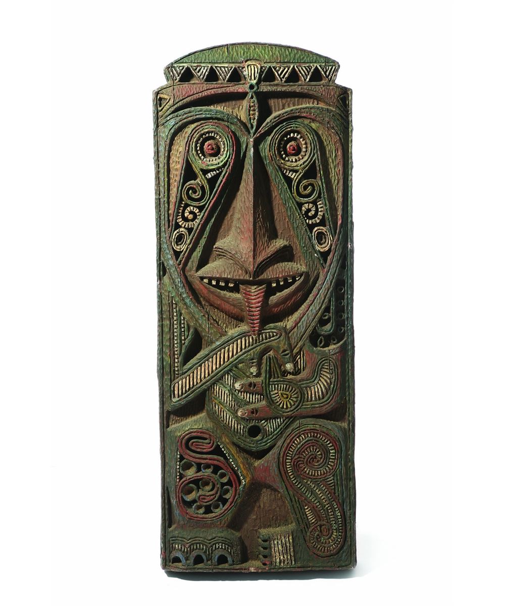(Walt Disney World, 1972) Rolly Crump most likely sculpted this shield, and the original versions were placed on the 4 corners of the Enchanted Tiki Room fountain. When Walt Disney World was being built in 1971, additional casts of many Tiki Room props were added to the Polynesian Resort as decoration. This shield was from a juice stand at the resort. In good condition with light wear. Measuring 18”x5”x48”.