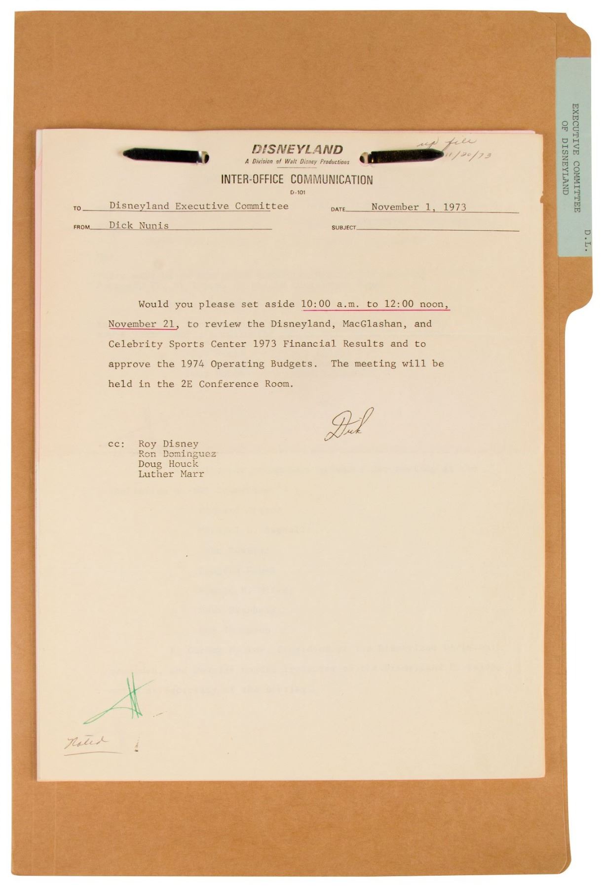 (Disneyland, 1970s) A set of Disneyland Executive Committee inter-office communications sent to Mel Melton, former President of WED Imagineering. The documents contain minutes to meetings, financial reports, and additional administrative information. Several of the pages bear Melton's initials in green ink. The packet includes 17 8.5"x11" pages within a folder labeled "Executive Committee of Disneyland". The document is in very good condition.