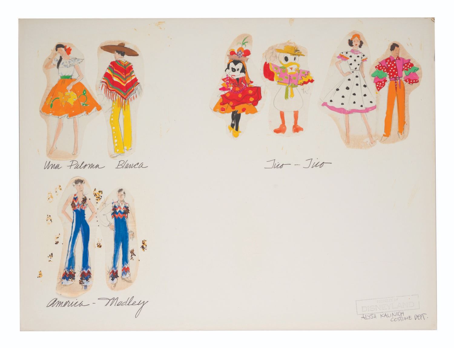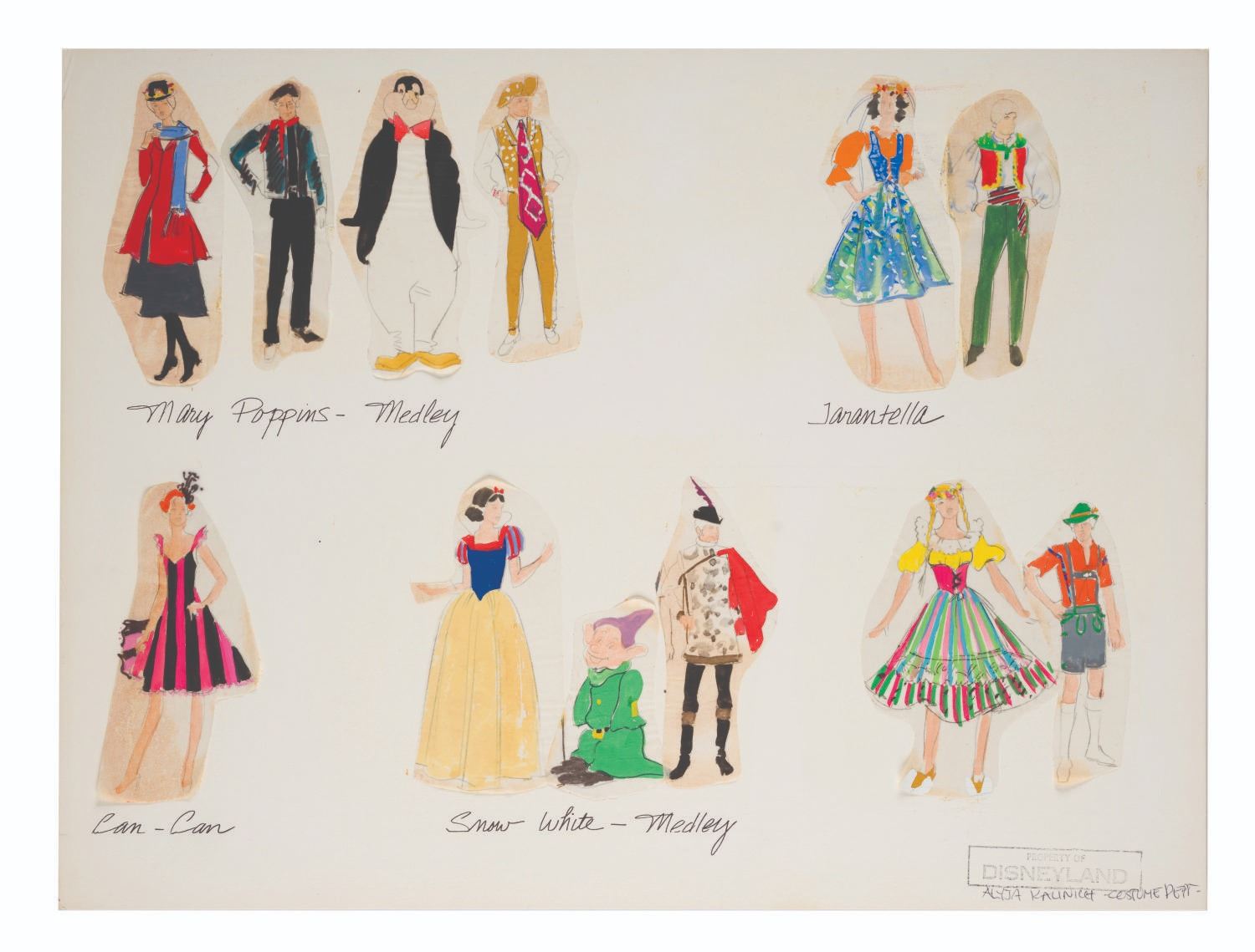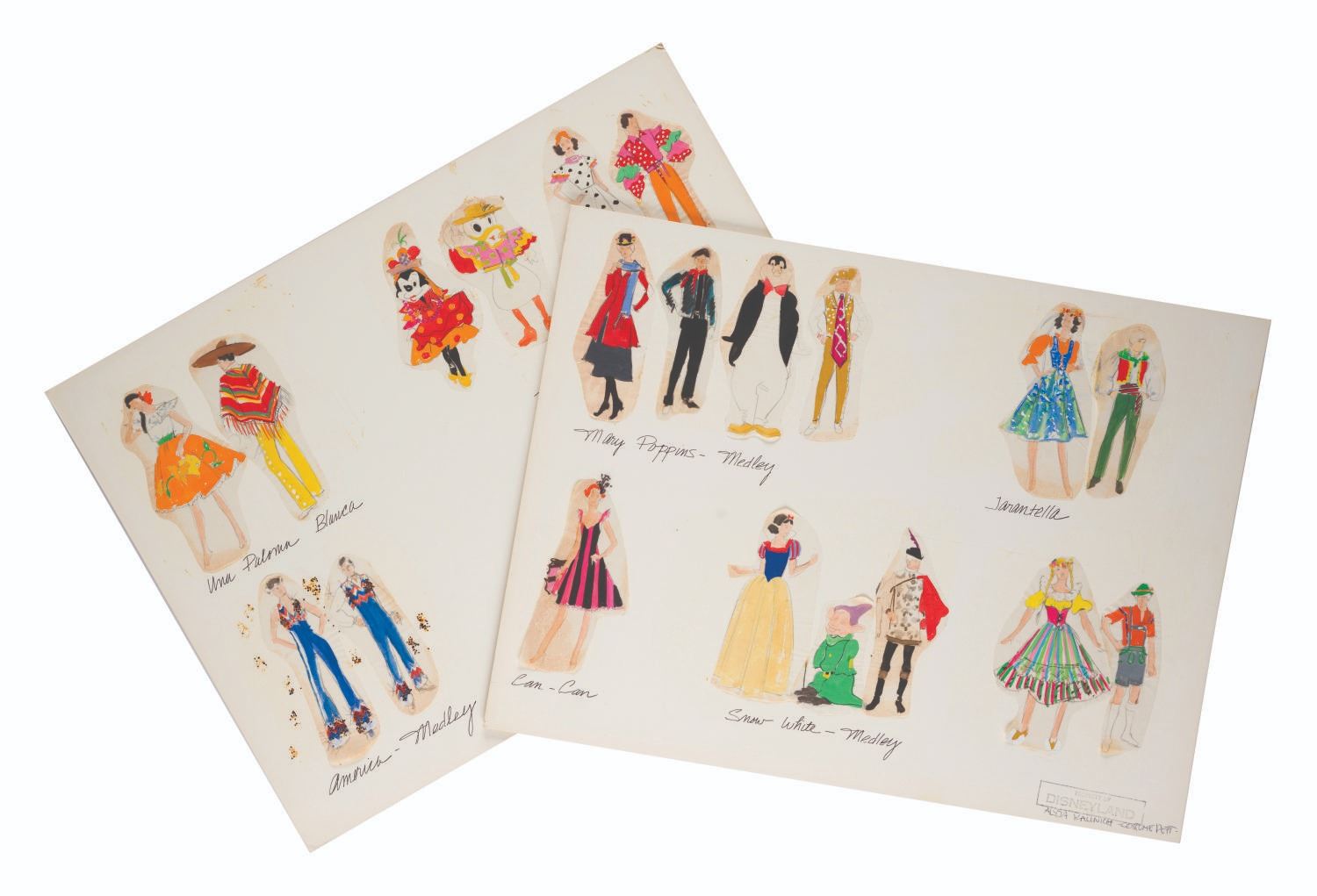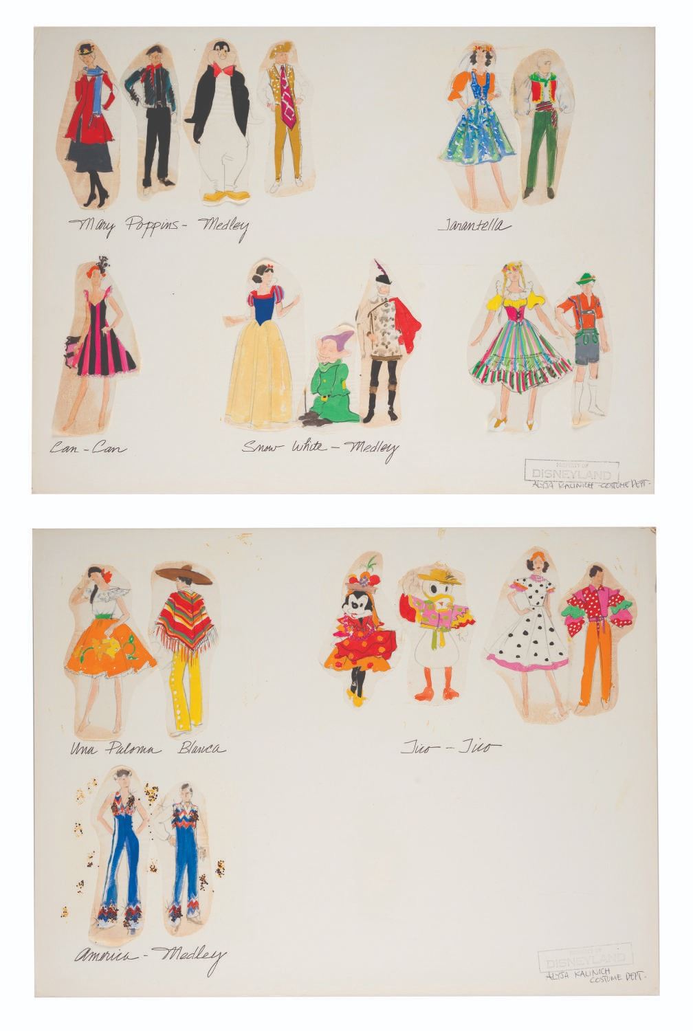 (Disneyland, 1979-80s) A pair of original costume designs and Disney Character overdressing for Fantasy on Parade by Imagineer Alyja Kalinich. Accomplished in graphite, ink, and marker, each drawing on 14"x17" drawing paper has been mounted to 15"x20" artists board. The artwork has a Property of Disneyland stamp and has been signed by the artist. The artwork is in very good condition with expected wear from age and use.