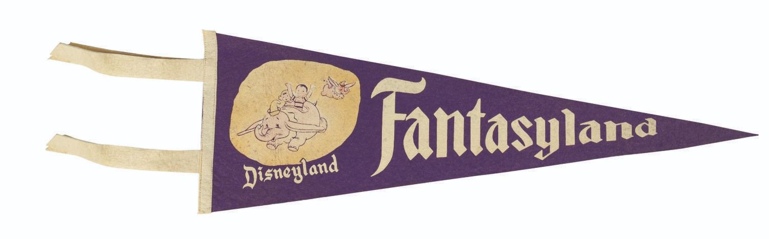 (Disneyland, c.1955) A rare and unusual Fantasyland pennant from Disneyland. Among the first souvenirs ever produced, the purple felt pennant features screened graphics based on early conceptual artwork for the park. Measuring 8.75"x26", the piece is in very good condition with general color softening and darkening to the white elements from age.