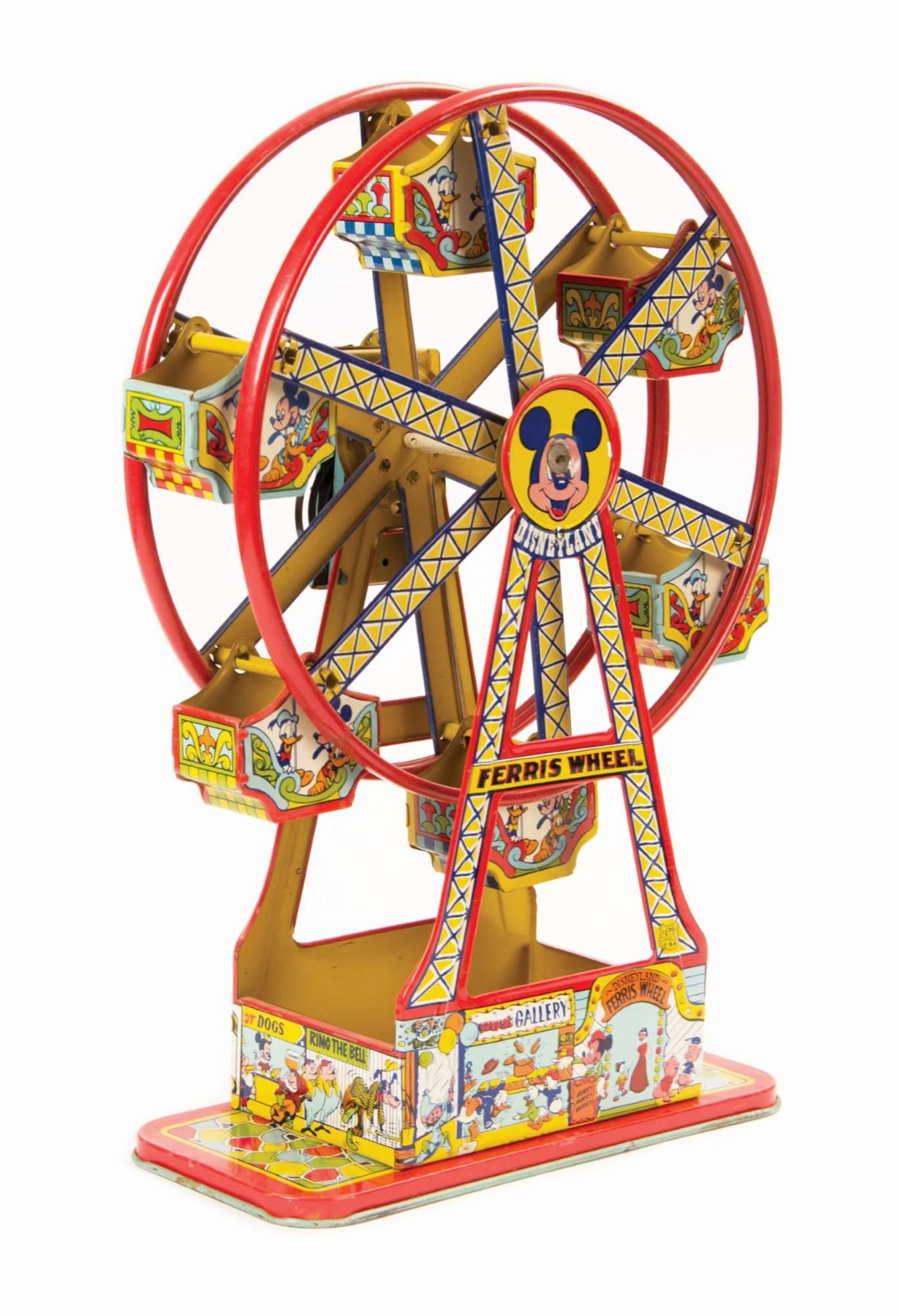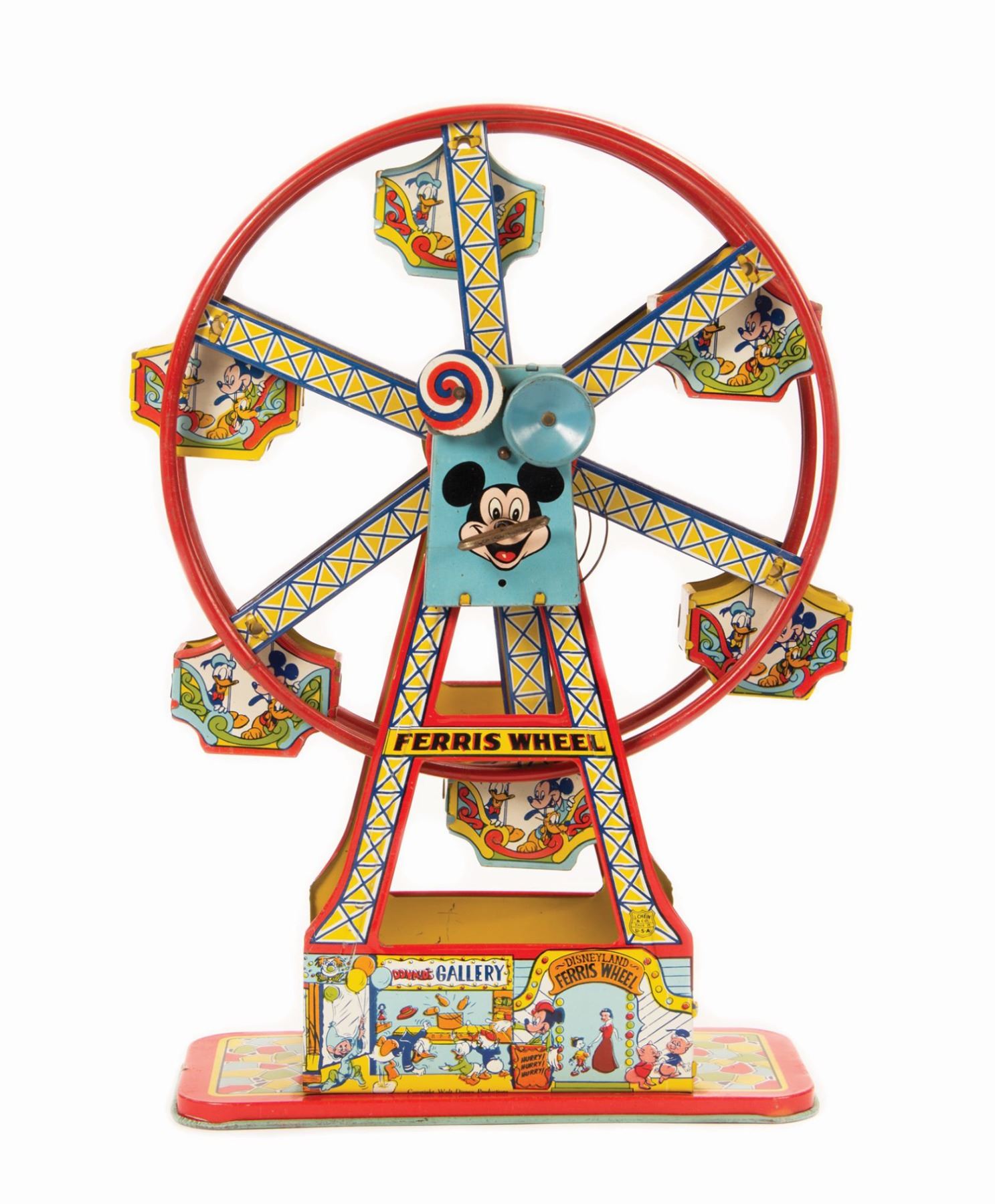 (Disneyland, 1950s) A vintage tin lithograph Disneyland Ferris Wheel wind-up toy manufactured by J. Chein & Co. The mechanicals have been tested and are in working order. Measuring 16.5"x12.5" and 5" deep, the toy is in very good condition exhibiting only minor wear and a few scattered chips.