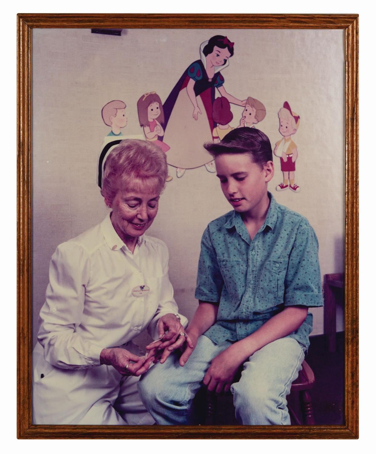 (Disneyland, c.1960s) A large photograph from the Disneyland First Aid station. Formerly found in the waiting room for First Aid, this photograph shows a Disneyland nurse tending to a young man's injured finger. Measuring 21"x17" overall, the photograph is in very good condition, with minor wear to the frame from park use.