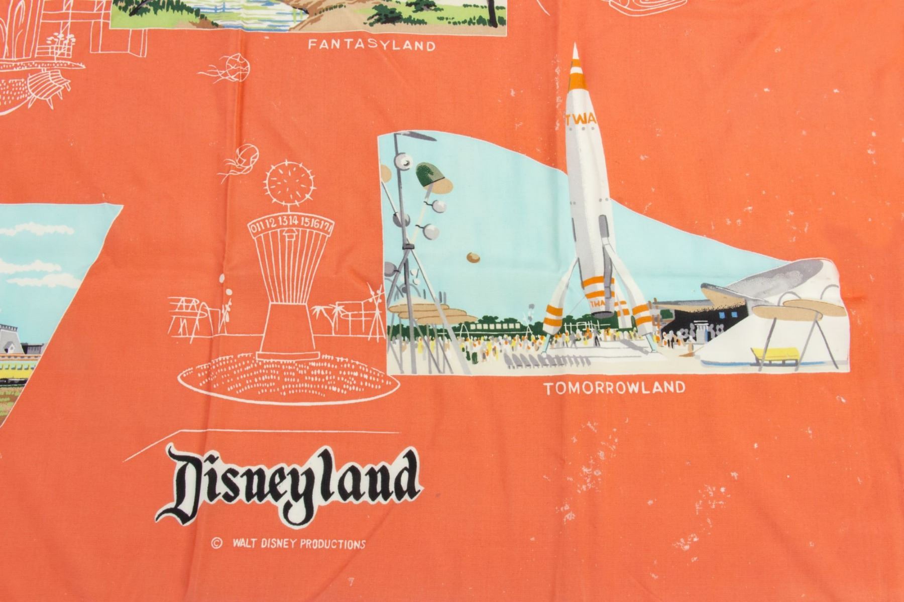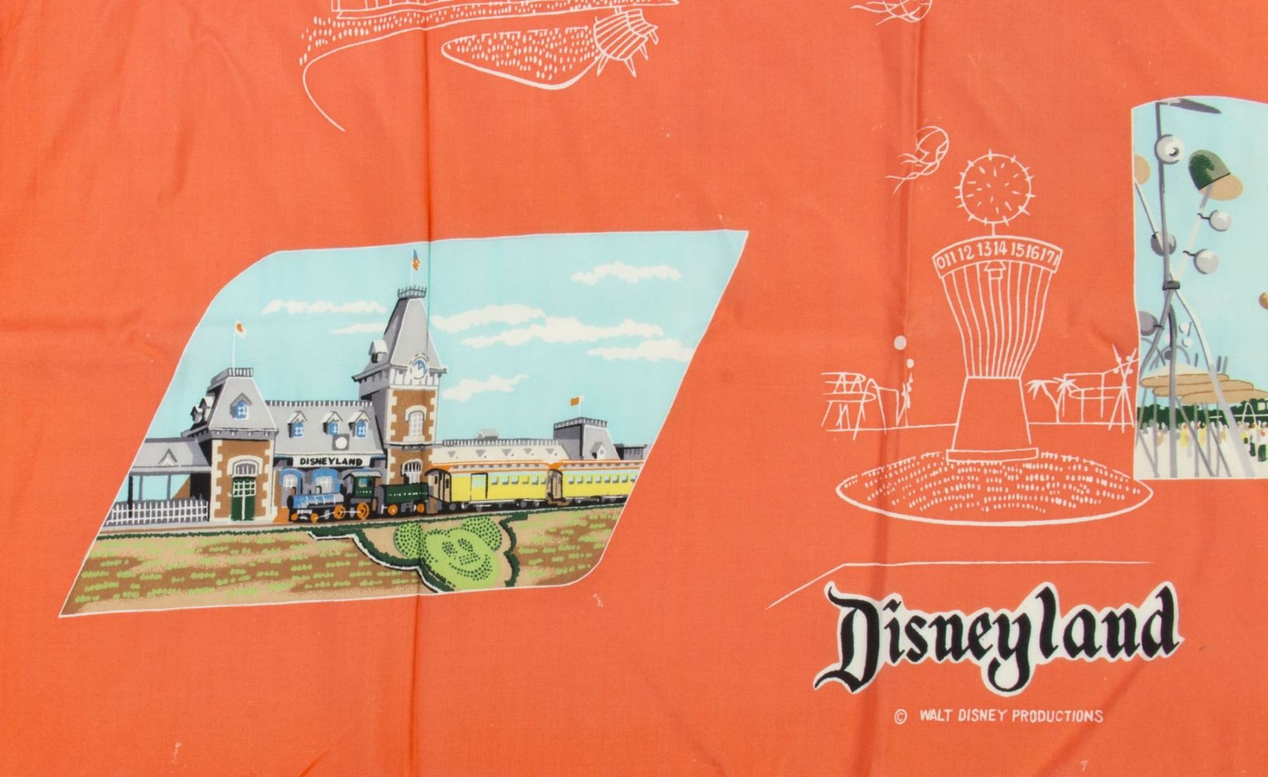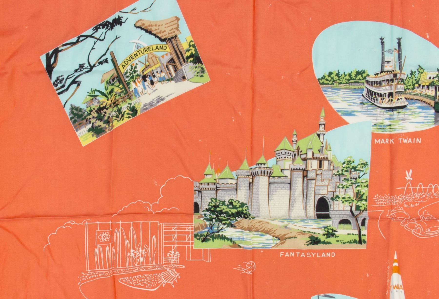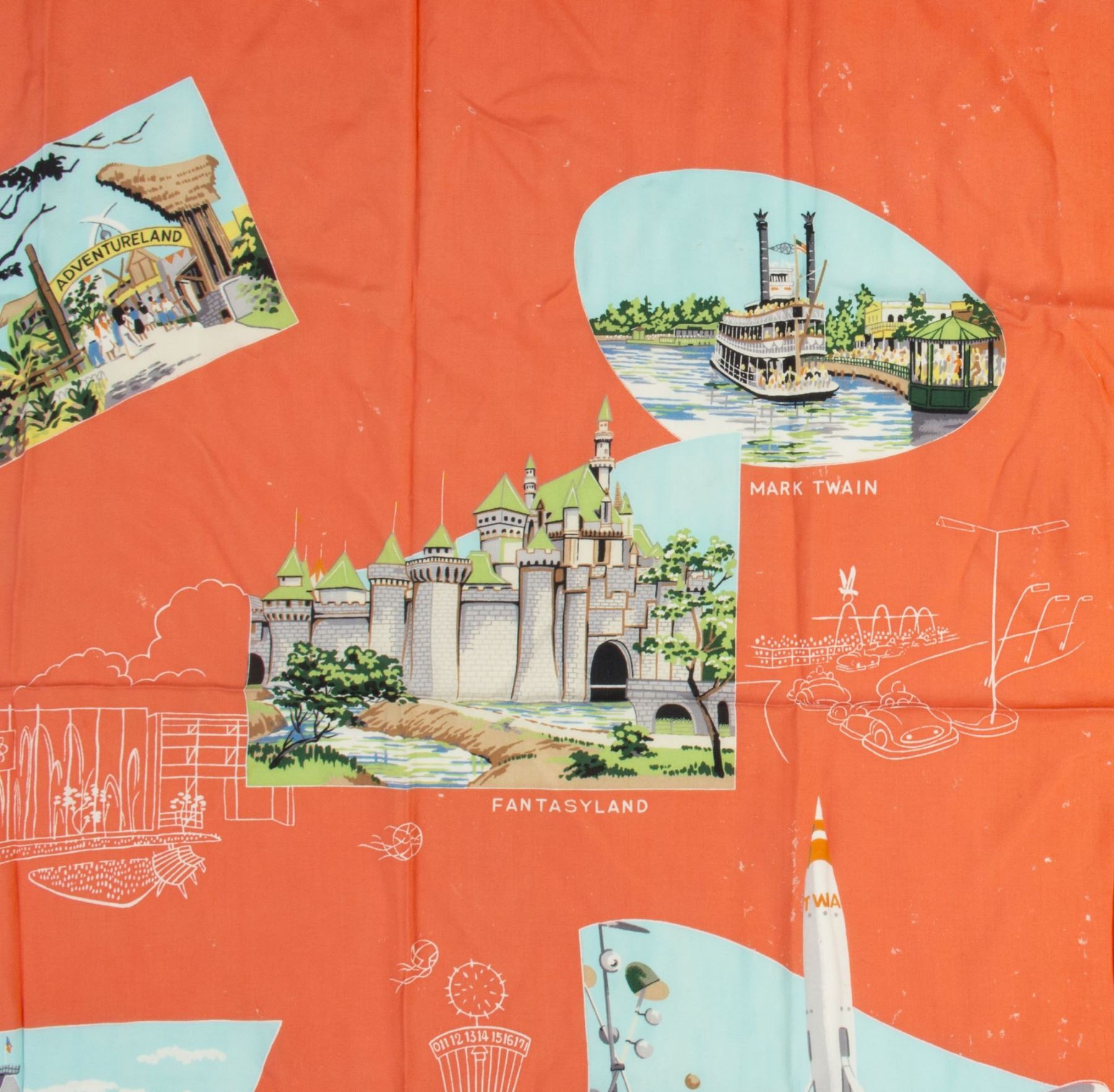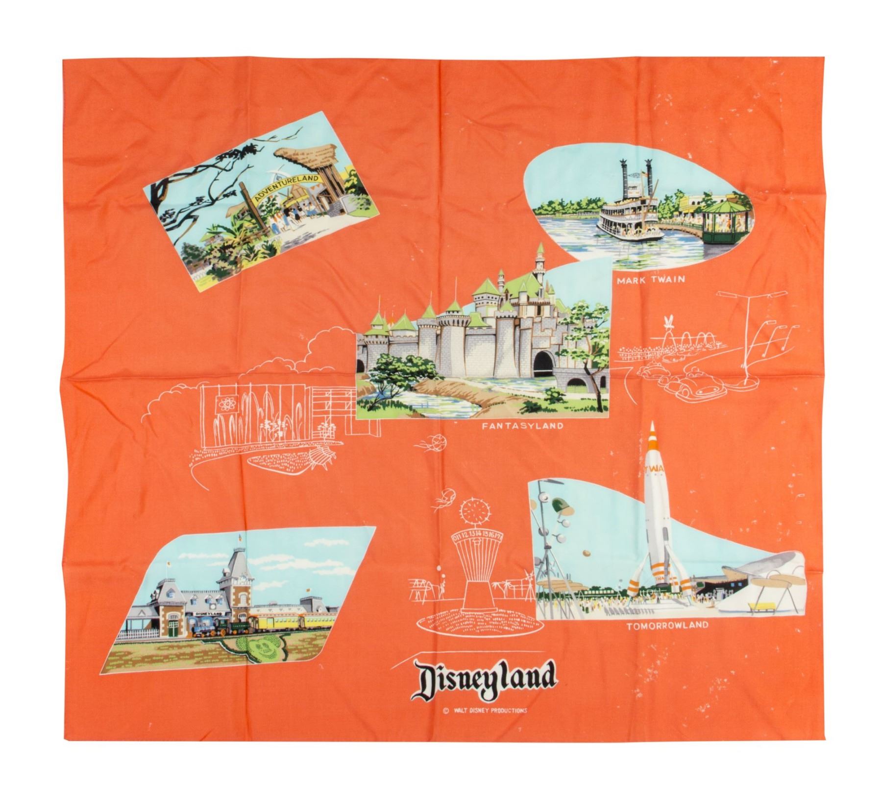 (Disneyland, c.1959) A decorative orange scarf featuring the five lands of the park. Incorporated into the background are white outlined images of elements or attractions of the park. Measuring approximately 28"x28", the scarf is in fair to good condition with some scattered spots of discoloration throughout.