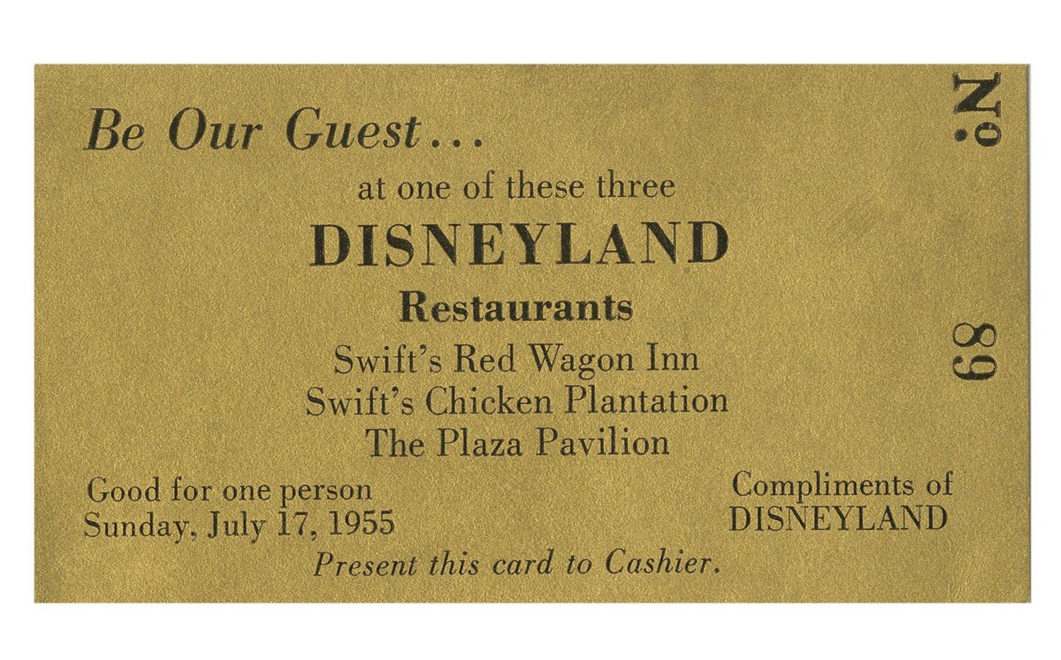 (Disneyland, 1955) An extremely rare complimentary food ticket from Disneyland’s opening day celebration on July 17, 1955. This unused golden ticket reads, "Be our guest... at any of these three Disneyland restaurants" and lists Swift's Red Wagon Inn, Swift's Chicken Plantation, and The Plaza Pavilion. Marked as No.89, the ticket measures 2.25"x4" and is in very good condition with minor handling wear and minimal staining.