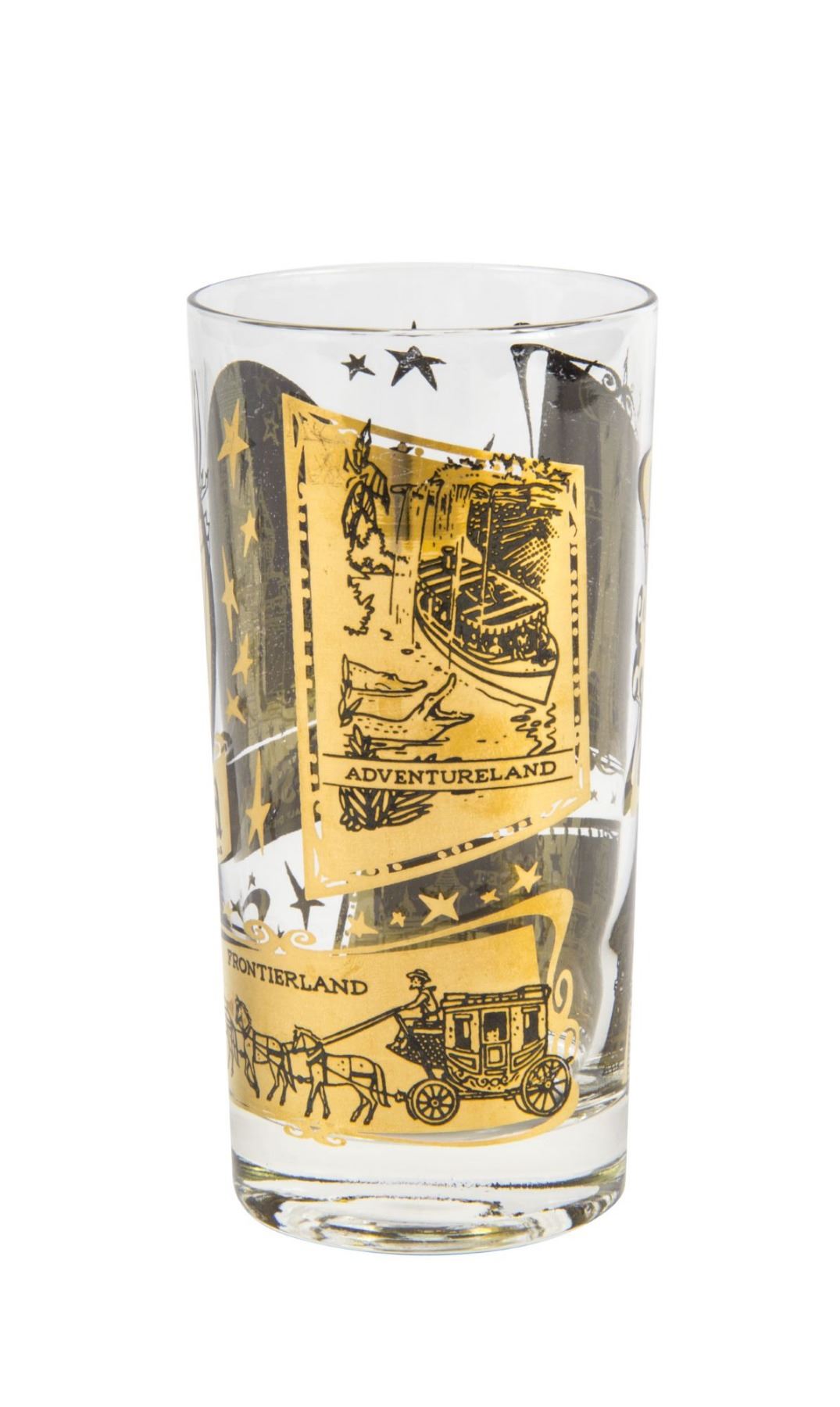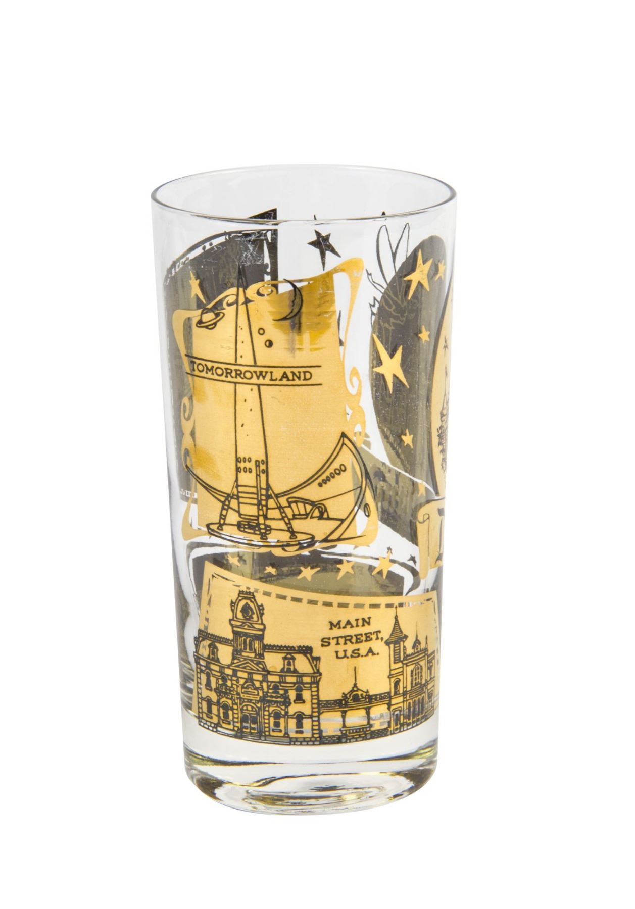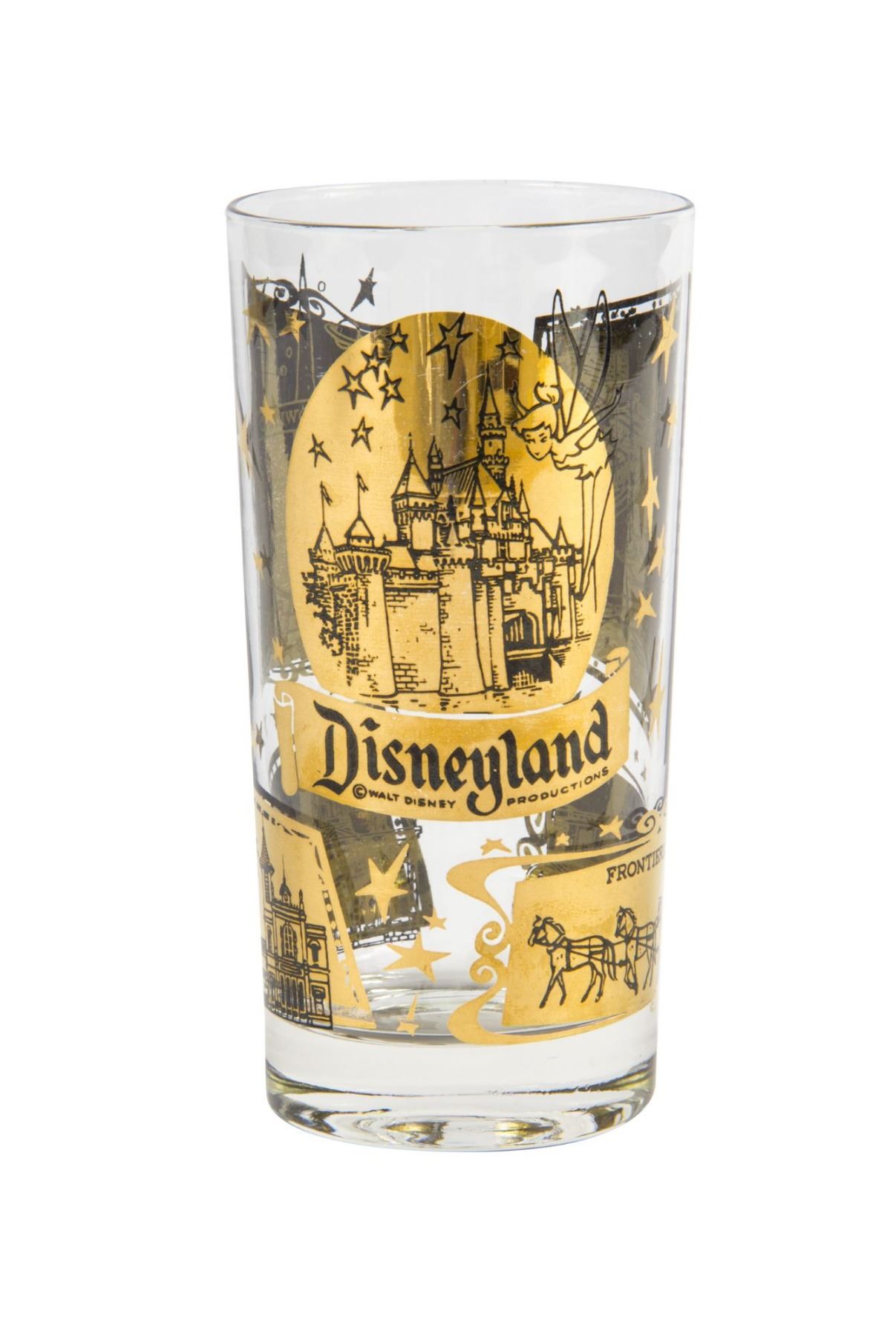 (Disneyland, c.1960) A gold-tone glass featuring a prominent Fantasyland image of Tinker Bell with Sleeping Beauty Castle, as well as imagery representing the park's other four lands. Measuring 2.75" in diameter and 5.5" tall, the glass is in good condition with some wear from use.