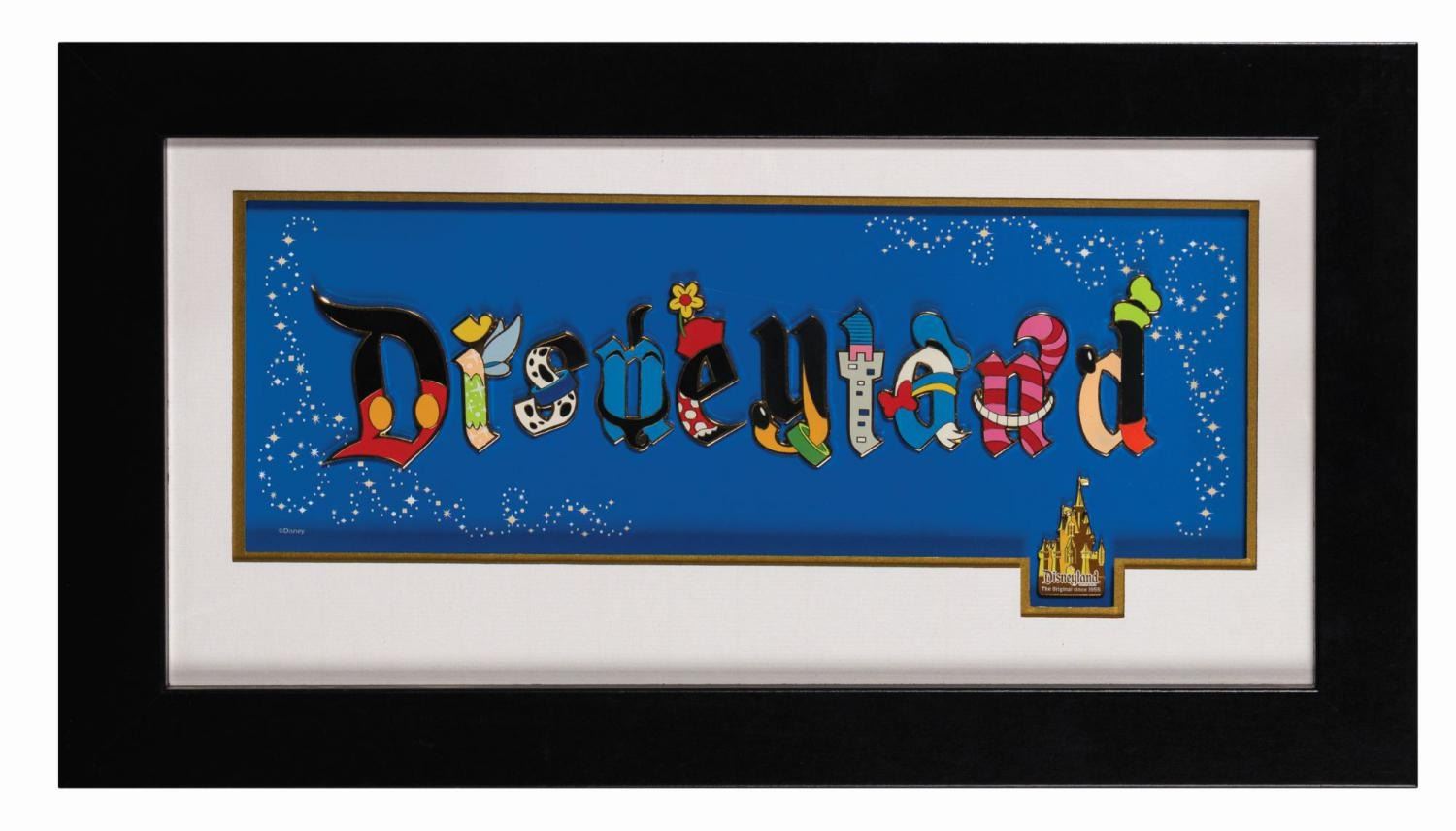 (Disneyland, c.2000s) A framed set of (11) enamel pins titled "Disneyland Gothic." Created in a limited edition of 500, the set takes the form of the classic Disneyland marquee text logo, and each letter pin is detailed with the physical attributes of an iconic animated character from Disney film history. The set is accompanied by a Disneyland COA. The pins range in size from 1.25"x1" to 2.5"x2" with a combined image area of 2.5"x10.5" within a 9.5"x16.5 black wood frame. The set is in very fine, as-new condition with minor wear to the frame.