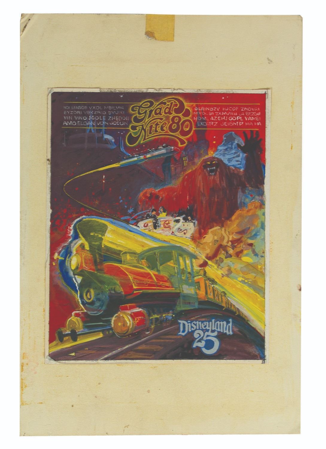 (Disneyland, 1980) An original concept painting for the Disneyland Grad Nite '80 Event poster. Accomplished in acrylic on a sheet of RC paper mounted to illustration board, the artwork juxtaposes iconic elements of the park including Big Thunder Mountain Railroad, the Mad Tea Party, Space Mountain, the Matterhorn, and Sleeping Beauty Castle. This piece comes from the collection of Milt Albright, who created the Grad Nite program. Measuring 8"x9.75" on a 10"x15" board, the painting is in very good condition with adhesive residue and soiling around the board from mask or mat removal, not affecting the image.