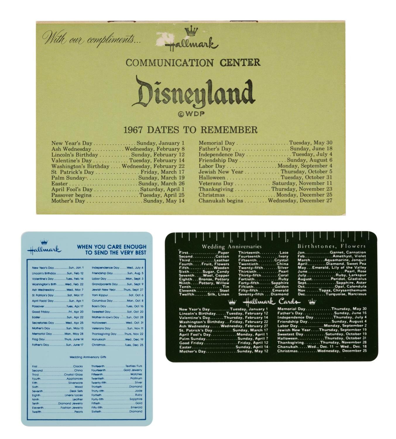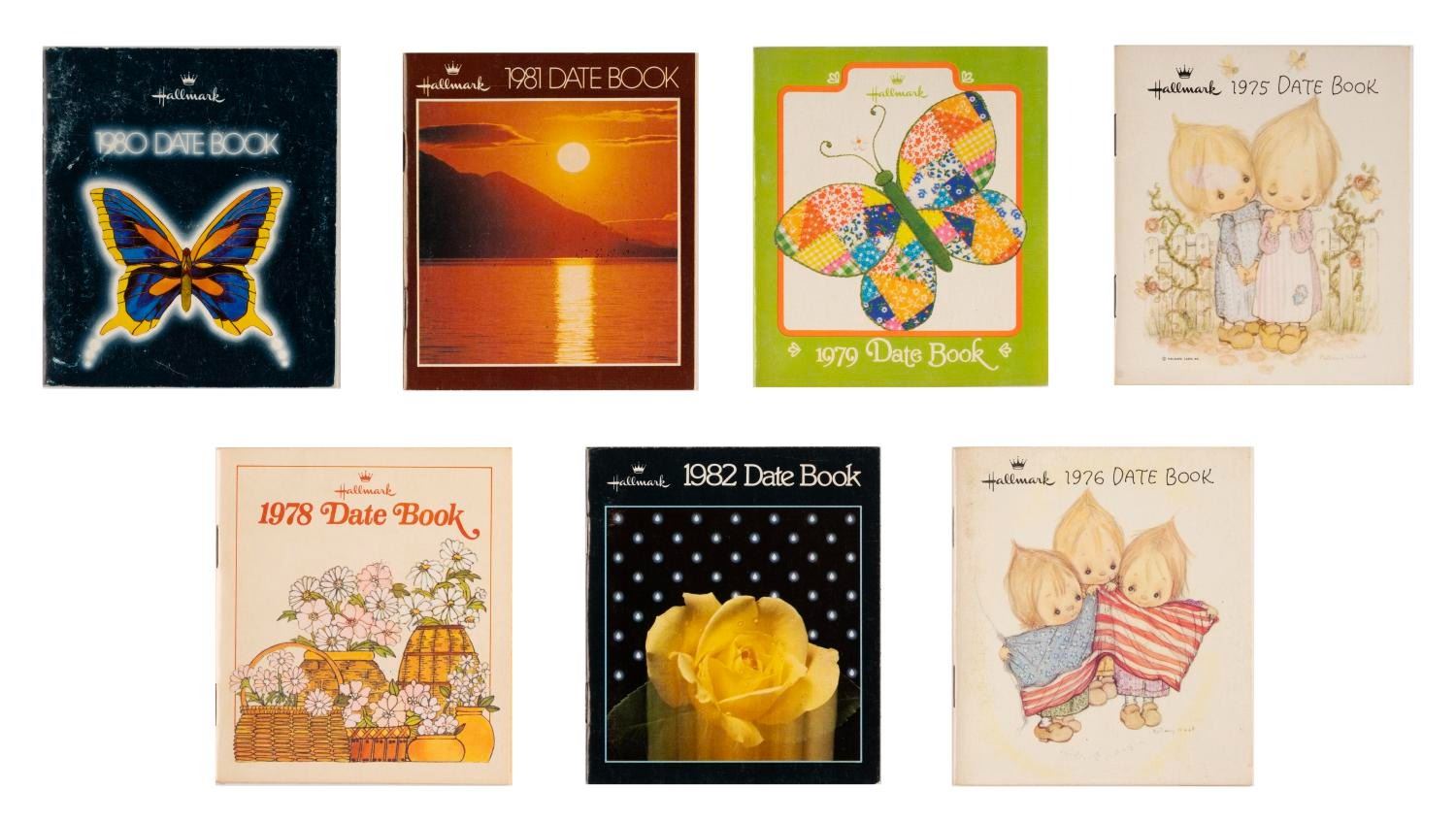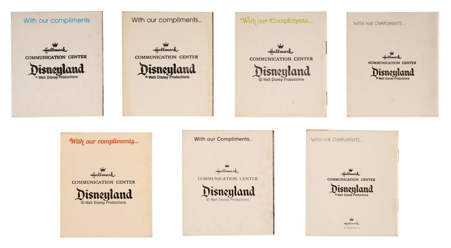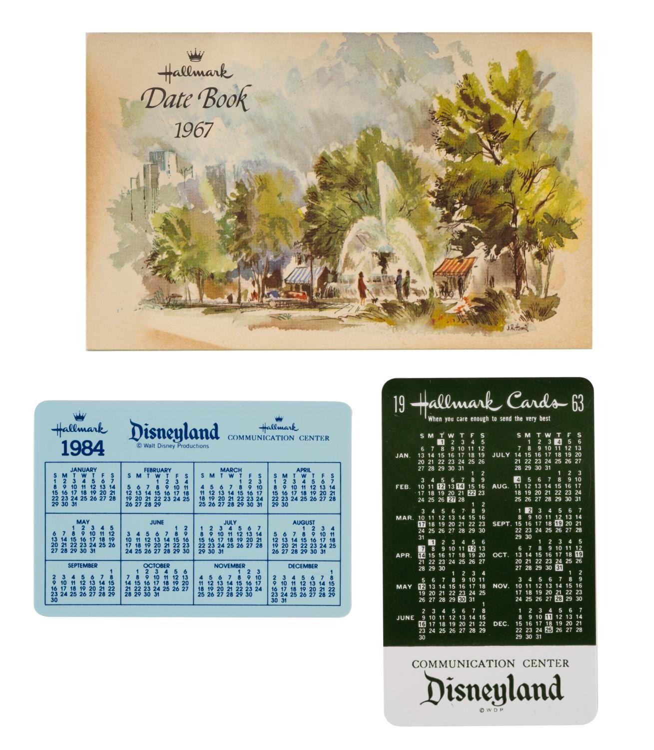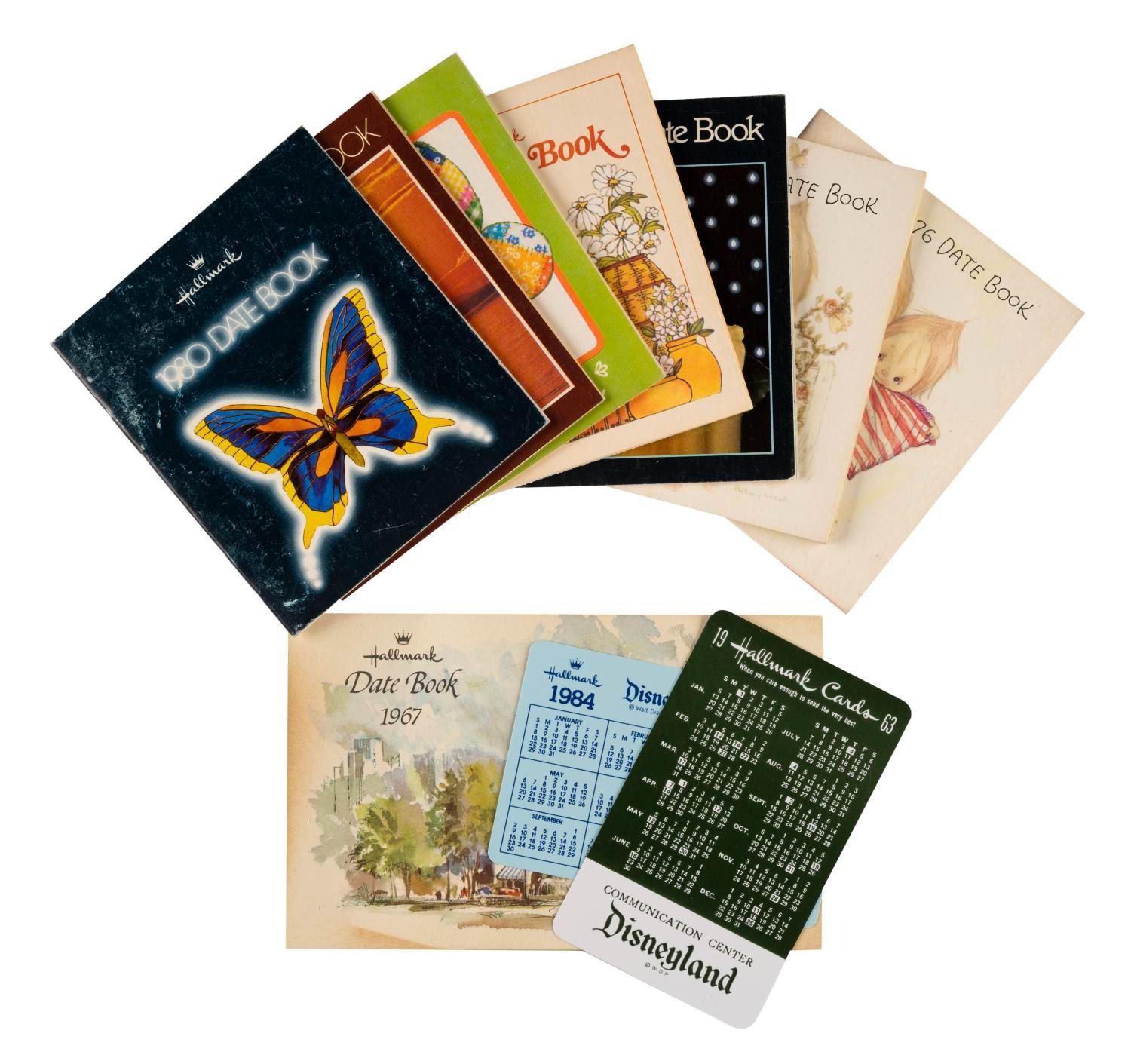 (Disneyland, 1963-84) A set of Hallmark Communication Center Date Books. Date Books and Calendar Cards were complimentary souvenirs of Hallmark Shops around the country, and these books are stamped and marked as souvenirs of the Hallmark Communication Center at Disneyland. This collection includes eight Date Books and two cards. The books measure 3.5"x4" and 5.75"x3.5", while the cards are 4"x2.5" and 3.5"x2.5". Each piece is in very good condition with some wear.