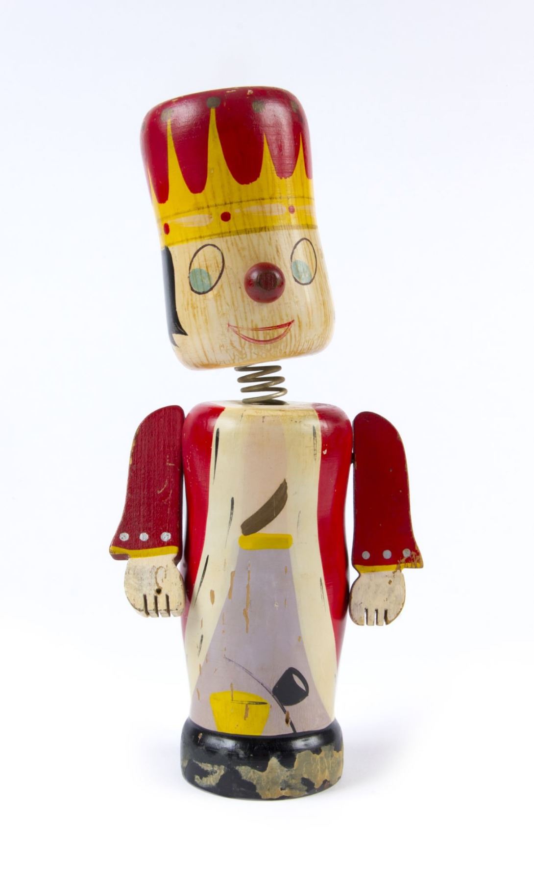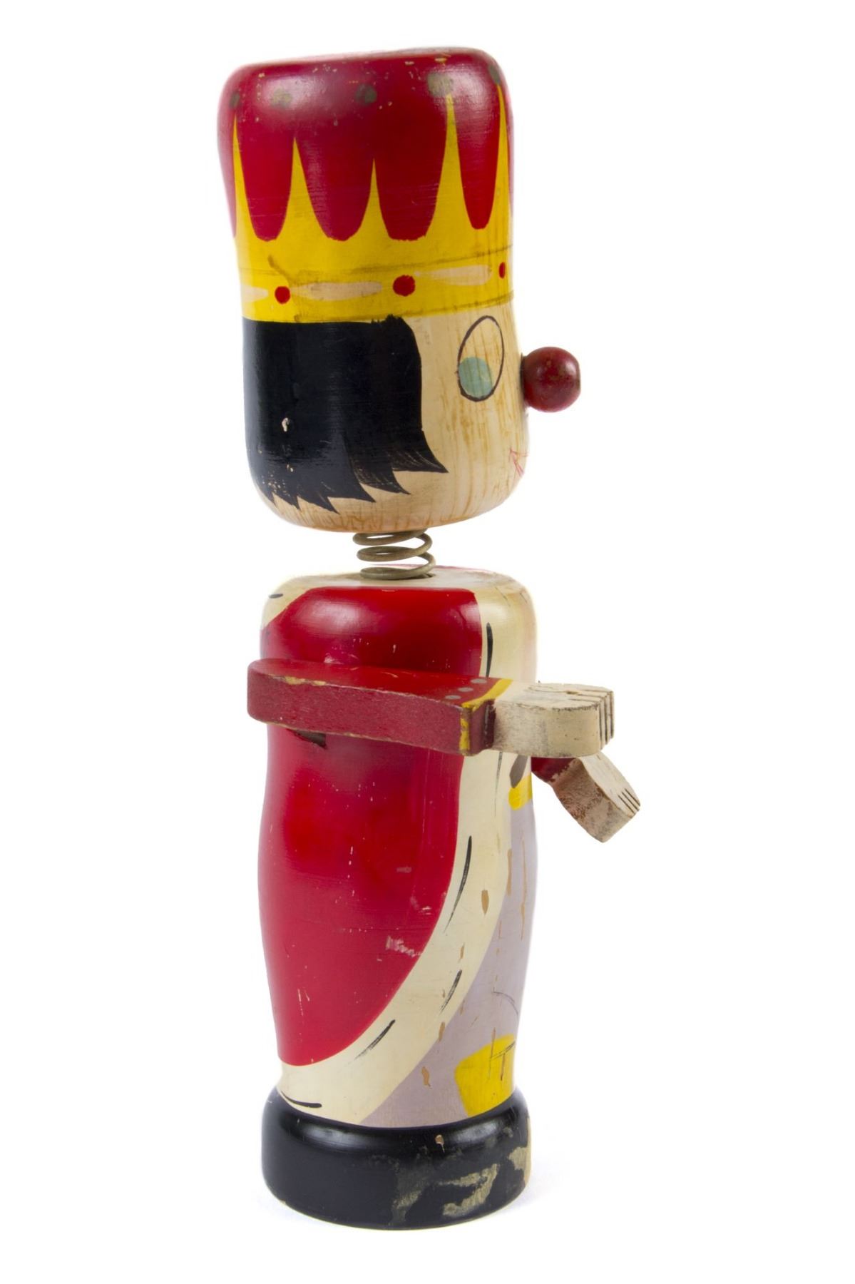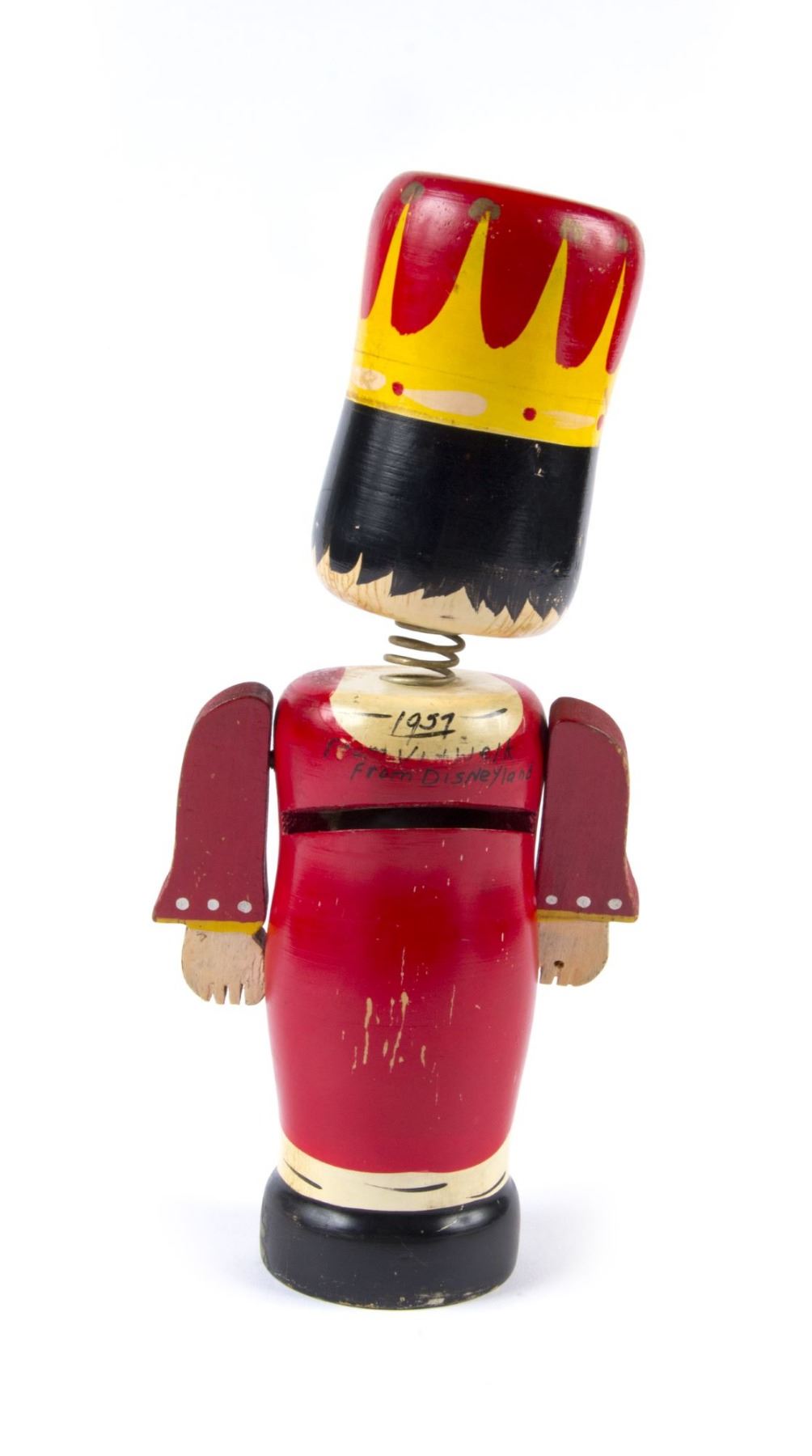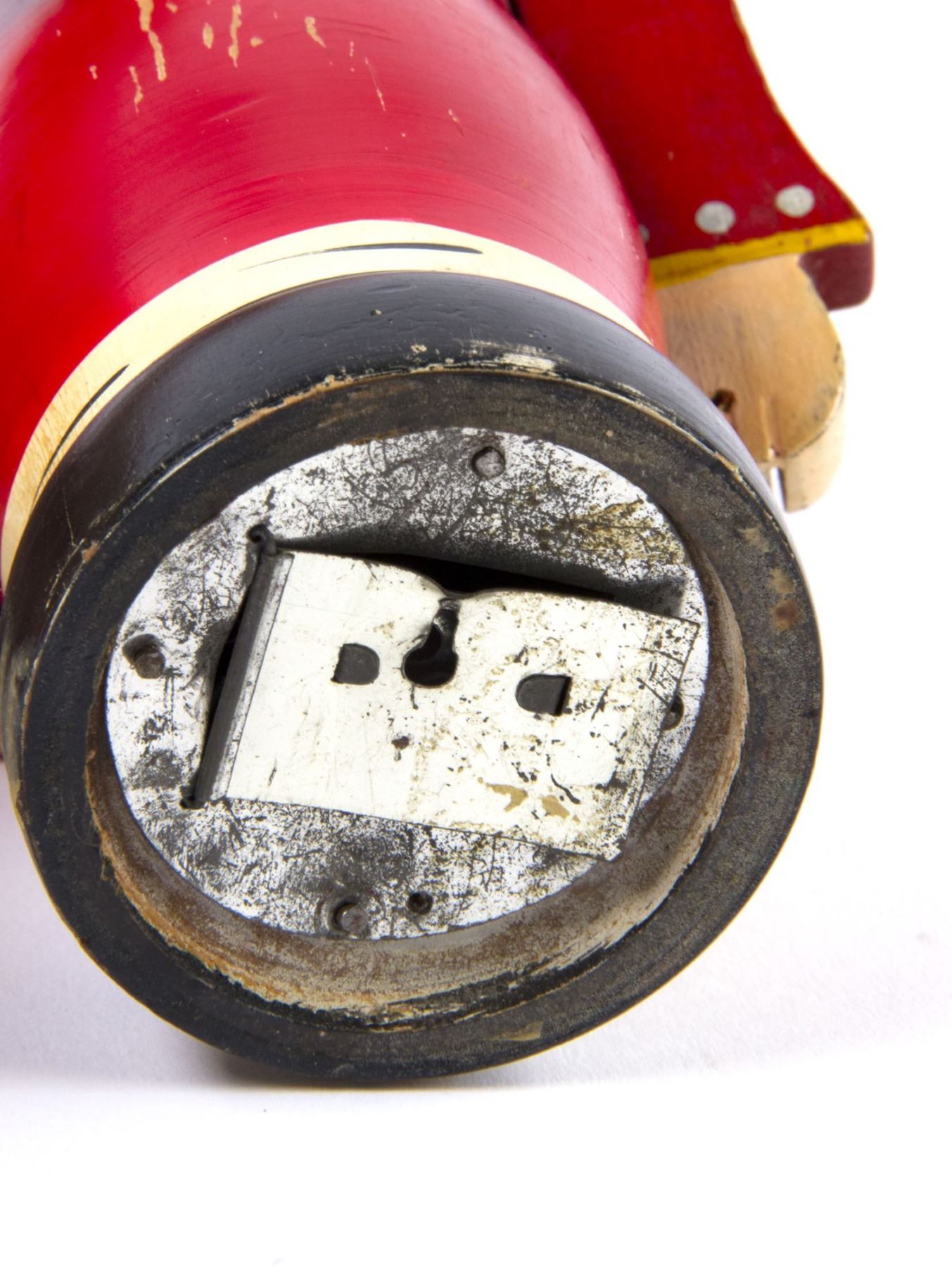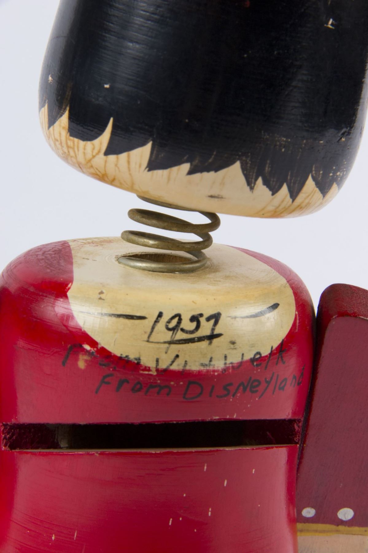(Disneyland, 1957) A hand-painted wooden coin bank from Disneyland. During the park's earliest years, the variety of souvenirs found in the different lands was incredibly unique. Many souvenirs from the early years of Disneyland have been lost over time since, without any clear markings, the knowledge that the souvenir originally came from Disneyland may have been forgotten. The back of this bank's body has a note in ink from the original owner which dates the bank to 1957. Measuring 10.5" tall, the bank is in fair to good condition with some paint wear and the latch on the base appears to no longer close.