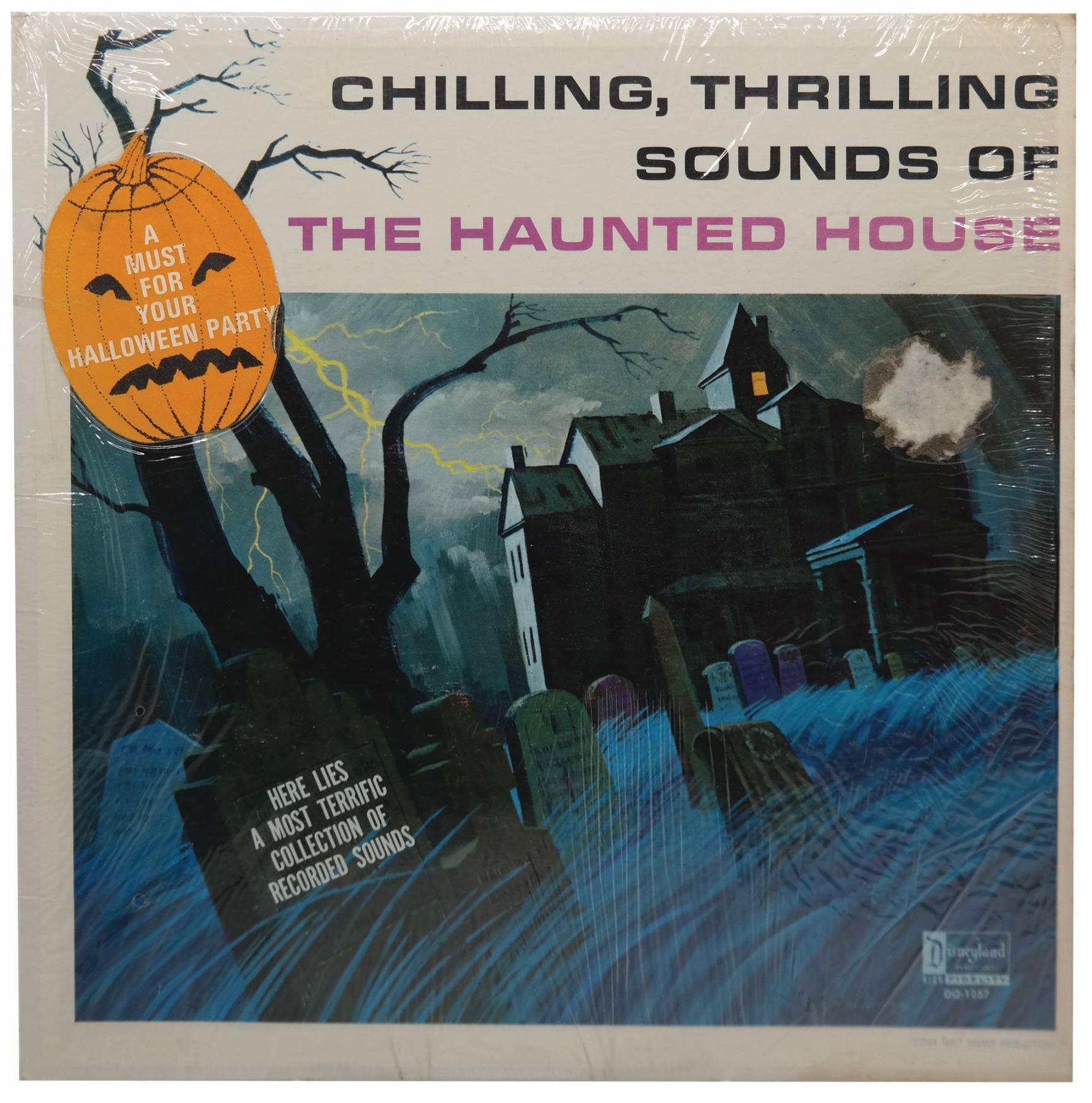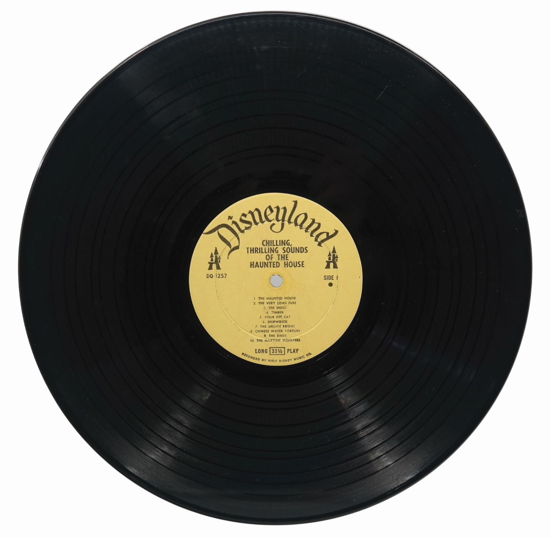(Disneyland, 1964) A 33 1/3 rpm souvenir record titled "Chilling, Thrilling Sounds of the Haunted House." The record contains tracks of various scary sound effects and was released just a few years before the Haunted Mansion opened. Measuring 12.5"x12.5" within its original album sleeve, the record is in good condition with minimal surface scratches to the vinyl and minor wear to the cover.