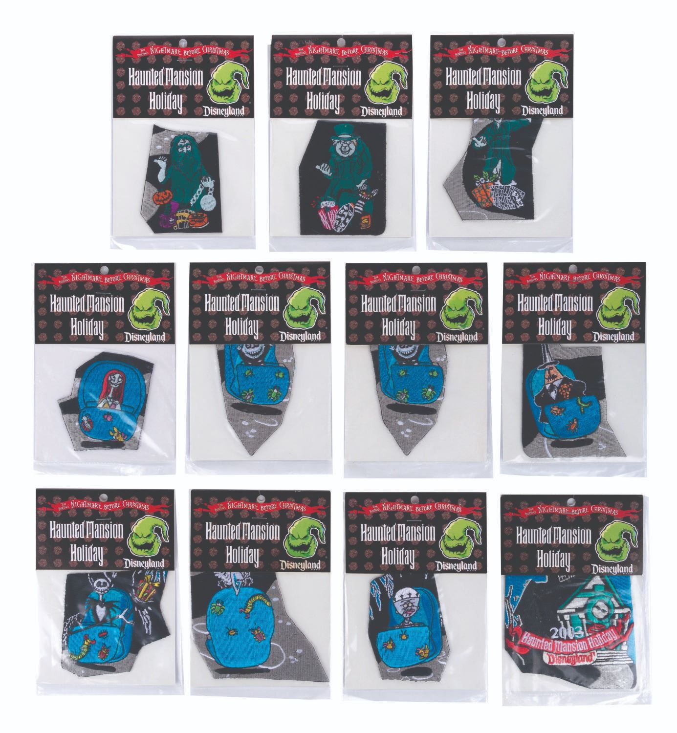 (Disneyland, 2003) A Disneyland Resort 2003 Haunted Mansion Holiday 11 patch collection, featuring characters from The Nightmare Before Christmas and the Hitchhiking Ghosts. Each piece is in fine condition in its original package.
