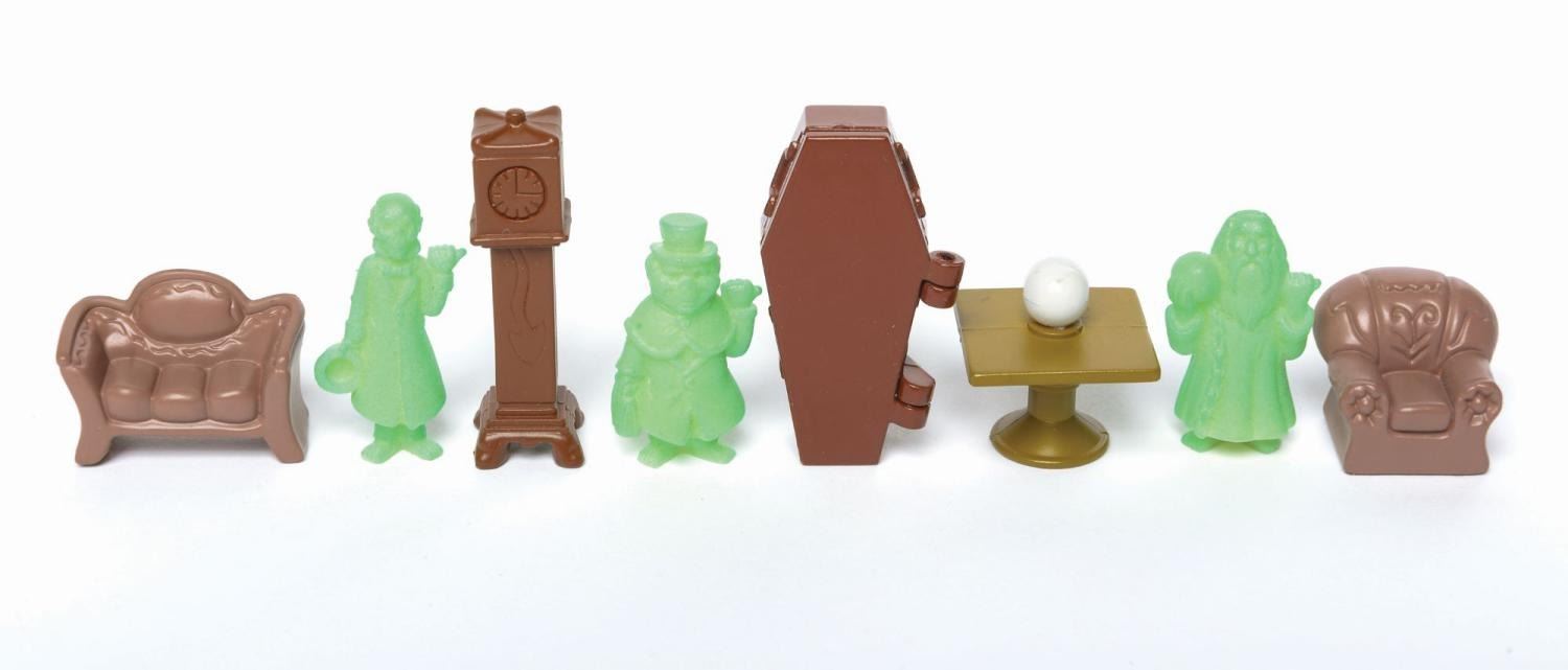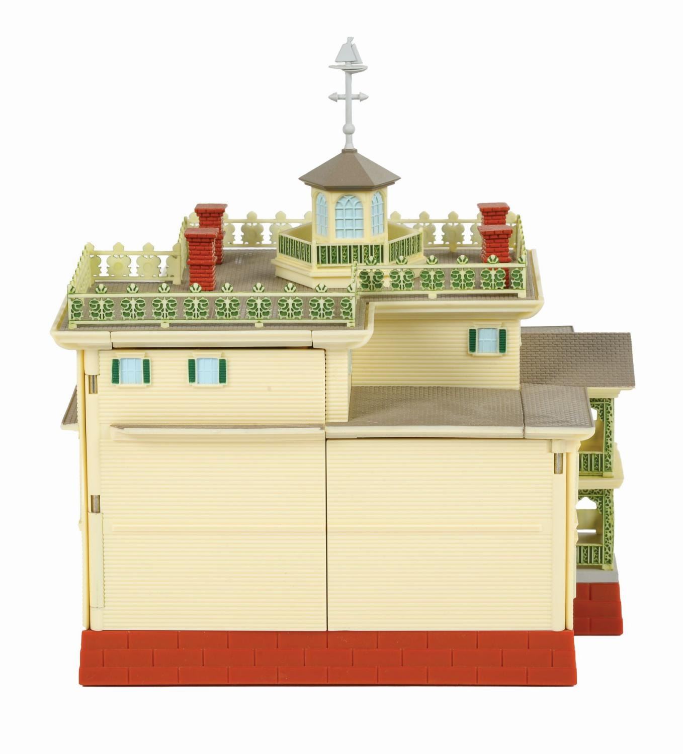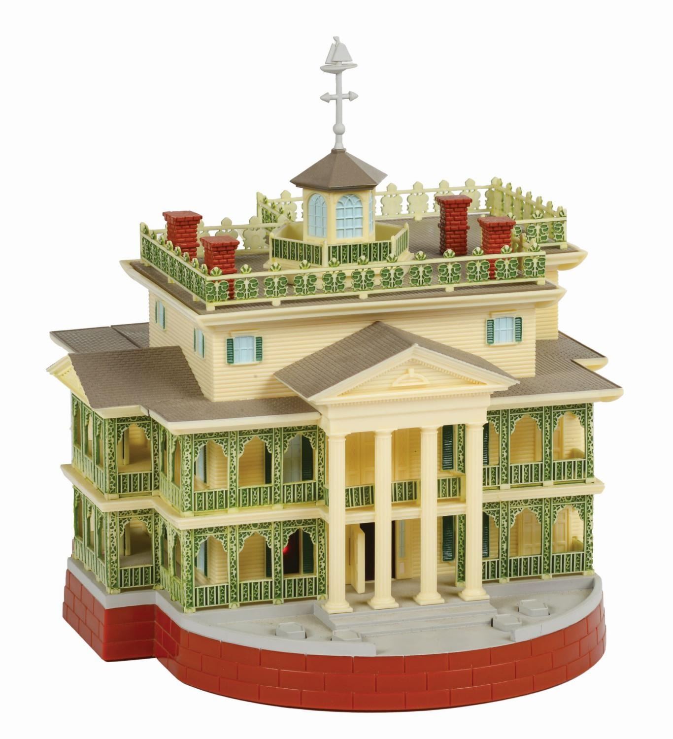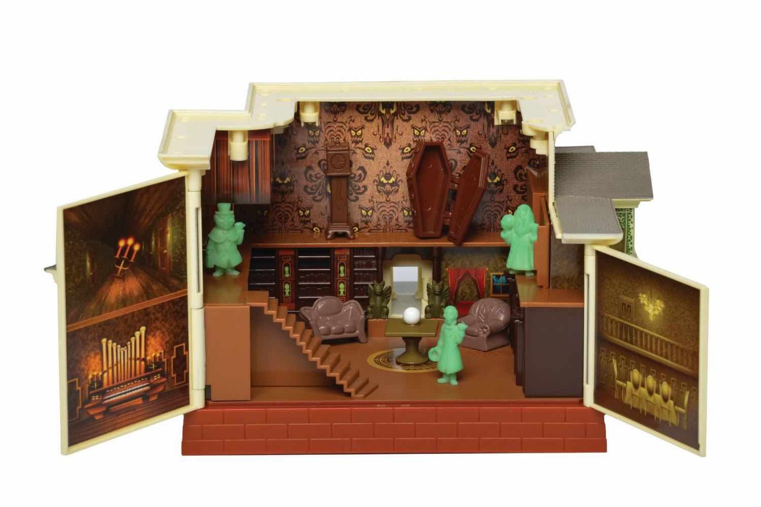 (Disneyland, c.2010s) A replica playset of Disneyland's Haunted Mansion with working lights and sound. The building's structure opens in the back to reveal the inner rooms of the Mansion, as well as several play pieces including the three Hitchhiking Ghosts, a grandfather clock, Madame Leota's seance table, and more. The set has hidden panels inside, and coffin-shaped buttons on the front say phrases such as "Welcome Foolish Mortals" and "I Didn't Mean to Frighten You". The replica measures approximately 9"x9"x9" and is in very good condition.