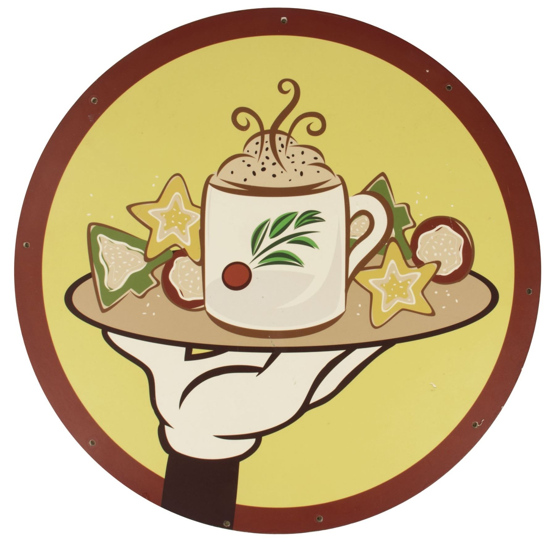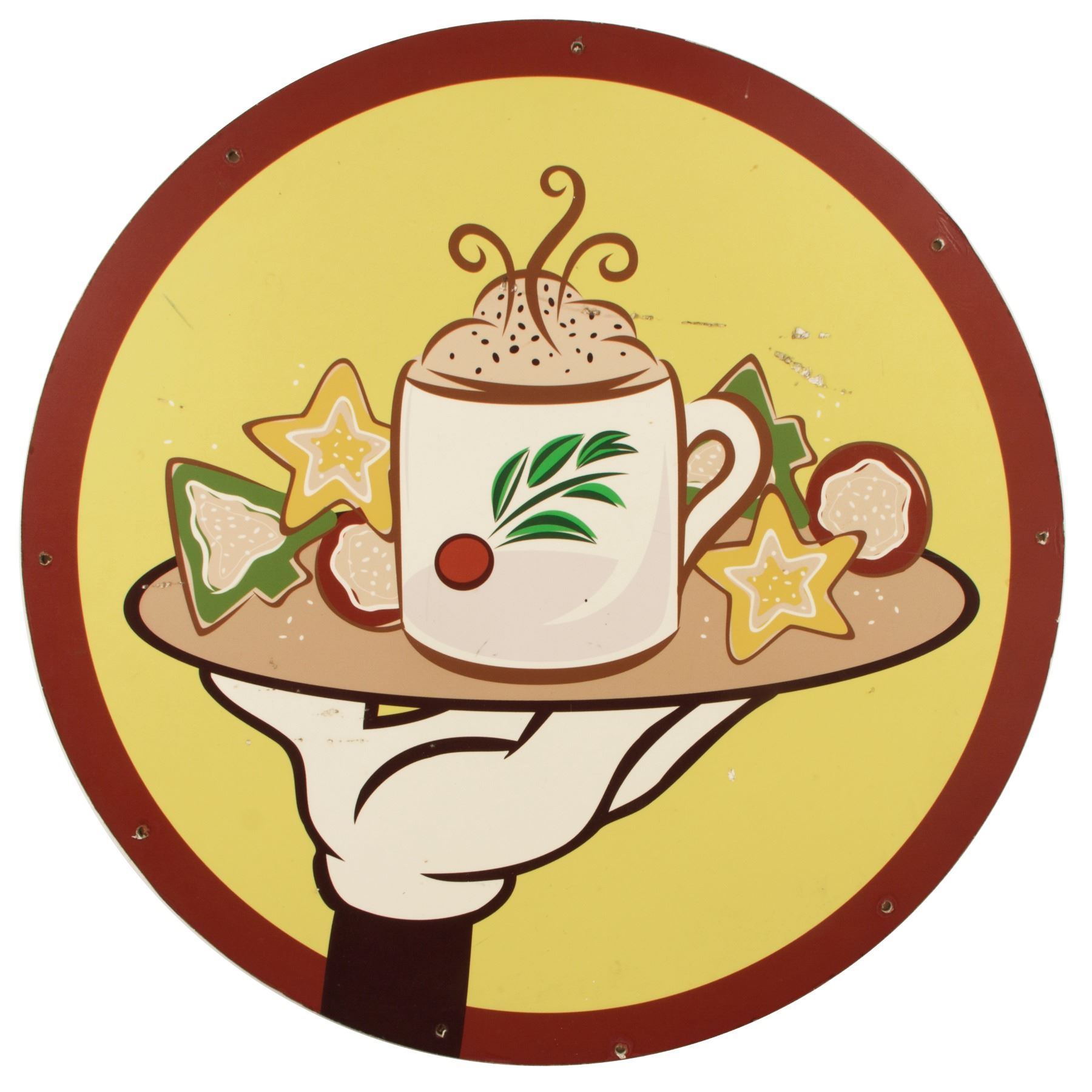 (Disneyland, 2000s) A large double-sided Disneyland sign used during Disneyland's holiday celebrations. Printed on plastic, the park-used sign features a great image of Mickey's hand holding a platter of holiday cookies and hot cocoa. There are several small holes around the edges from being mounted within Disneyland during a holiday celebration. The sign measures 23.5" in diameter and is in fair to good condition overall with some scratches and areas of discoloration from use.