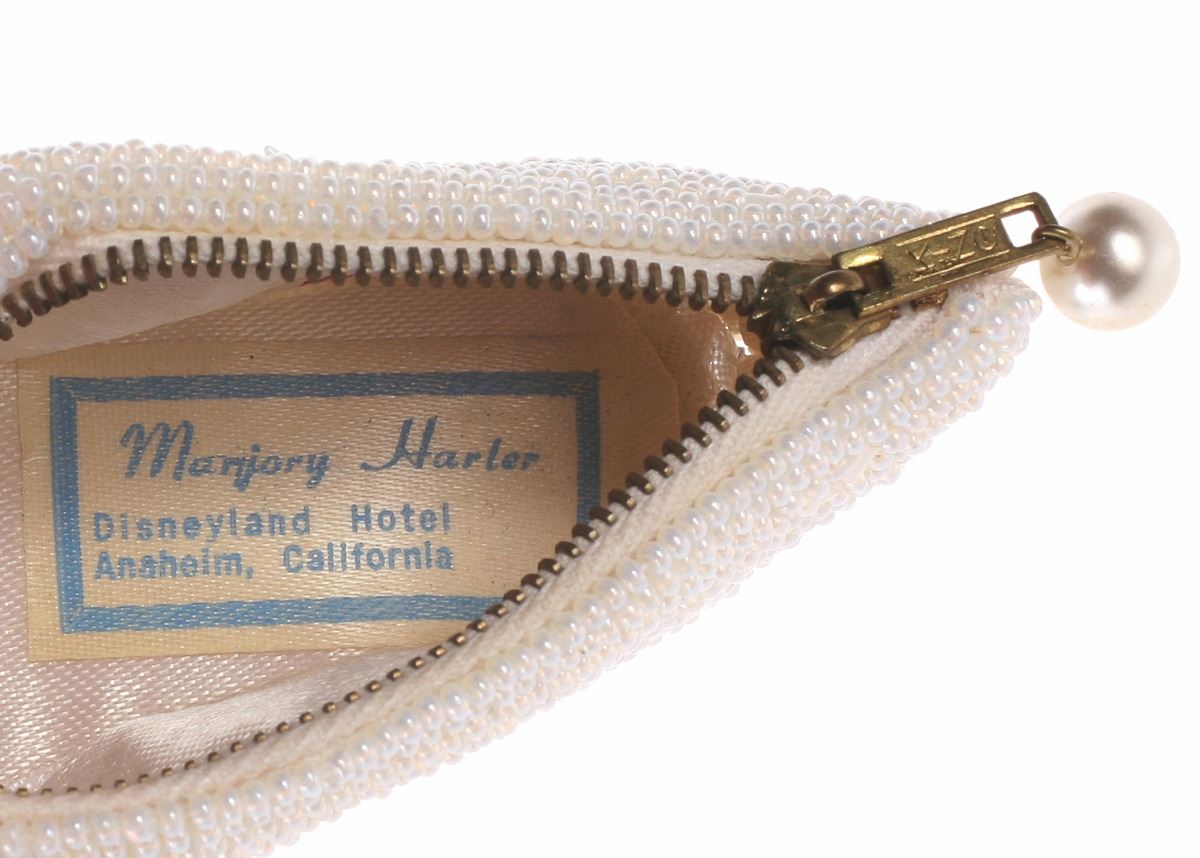 (Disneyland, 1960s) Pair of identical beaded coin purses shaped like a shoe and sold at the Disneyland Hotel. Crafted by Marjory Harler. One shoe has an identifying tag inside, while the other does not. Each measures 5"x1.75" and 1.5". In good condition.