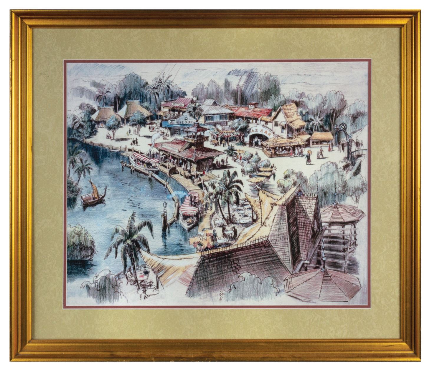 (Disneyland, 2000s) A framed print of Imagineer Harper Goff's concept art for Adventureland, depicting the entrance to the Jungle Cruise. This high-quality print was displayed at the Disneyland Hotel as a way of exhibiting some of the original design work that helped lead to the park as we know it today. The artwork has an image size of 19.75"x24.75" within its original 28.25"x33" gold-tone wood frame. The artwork is in very good condition with minor wear to the frame from its previous display at the Disneyland Hotel.