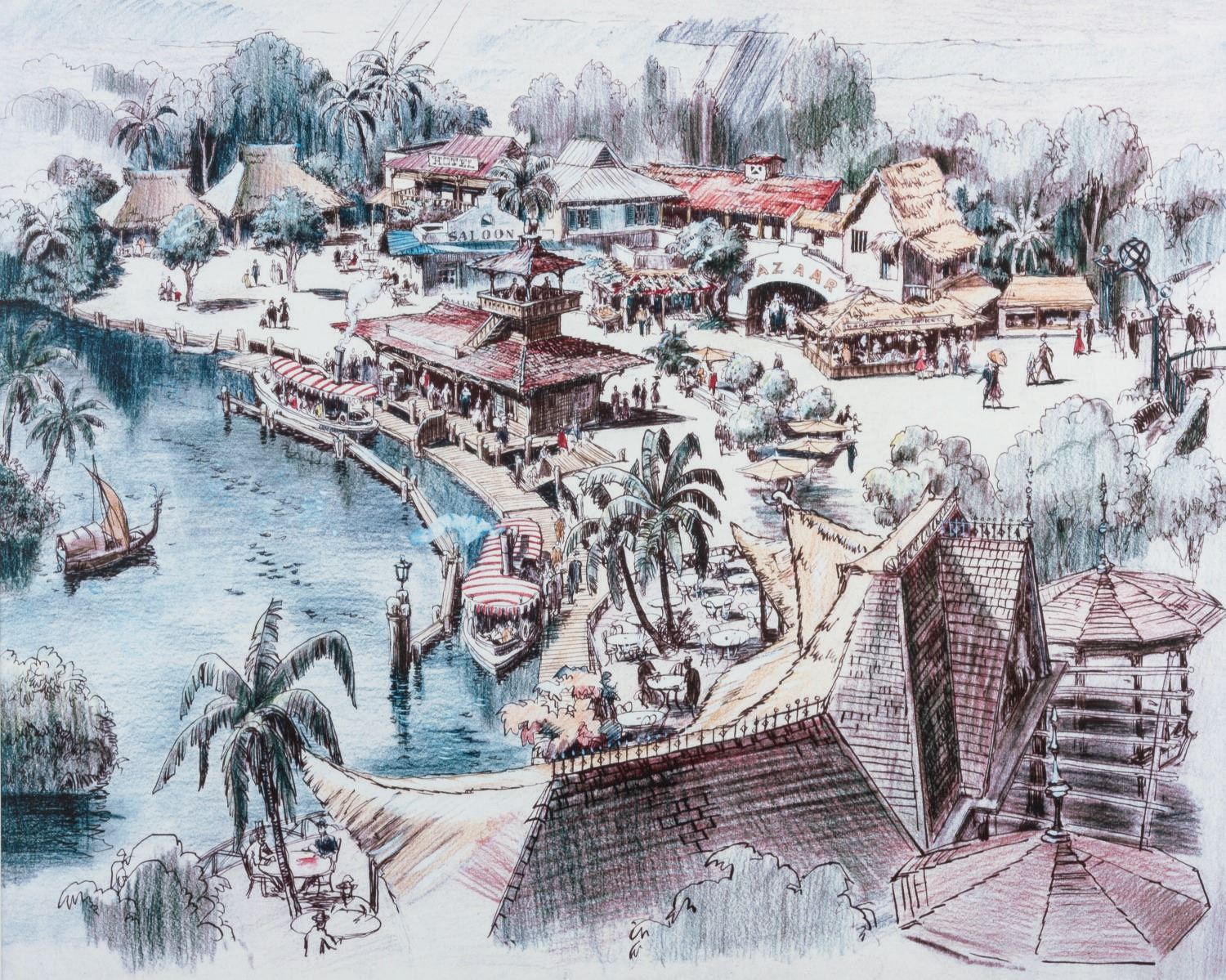 (Disneyland Hotel, 1990s) A framed print of Imagineer Harper Goff's concept art for Adventureland in Disneyland. Artwork from the history of the park is a fixture of the Disneyland Hotel's decor, and this framed print was on display at the legendary establishment for many years. Measuring 19.75"x24.75" visible through a 28.25"x33.25" gold-tone wood frame, the piece is in very good condition with some surface wear to the frame and chip to lower right of frame.