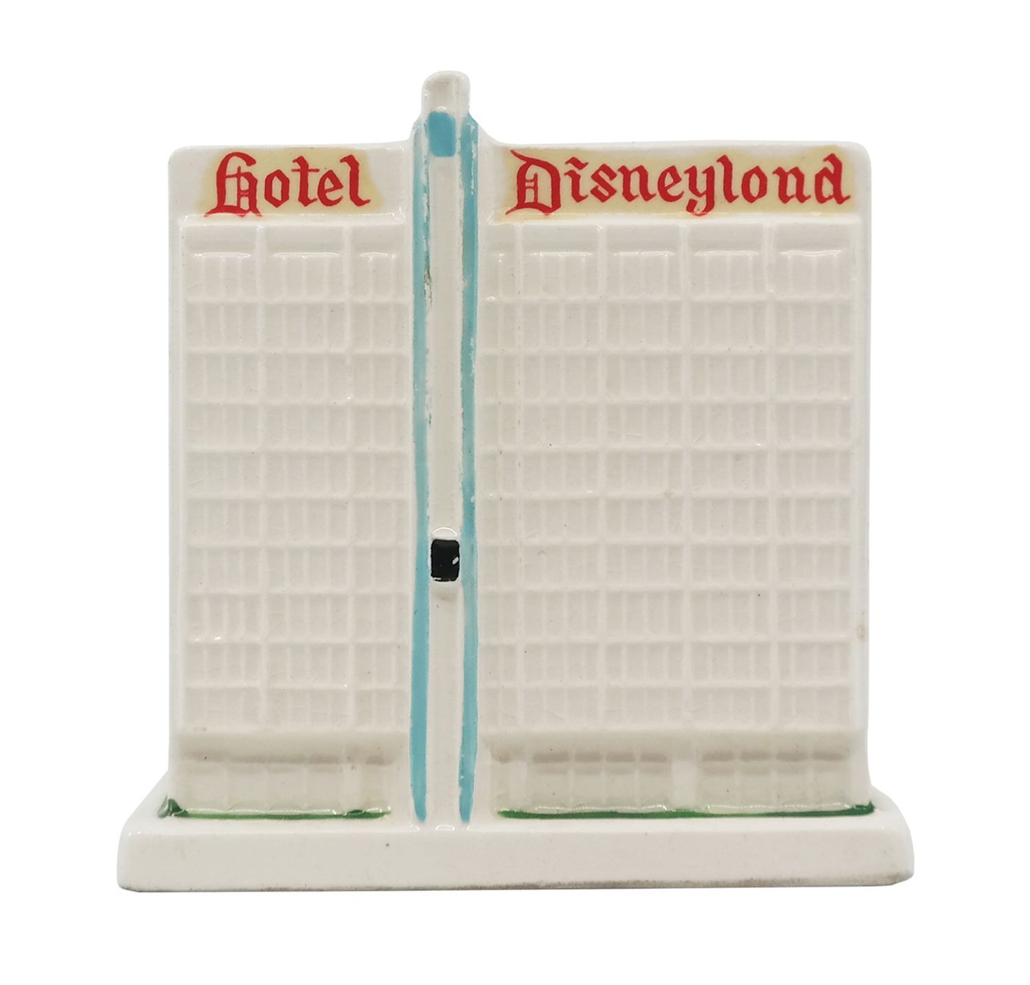 (Disneyland Hotel, c.1962) A very rare ceramic coin bank in the shape of the Disneyland Hotel. The charming souvenir was sold at the Taylor and Hume magic shop within the hotel, and is a fantastic visual representation of the popular Disneyland landmark. Measuring 3.75" tall, the bank is in good condition with typical crazing and minor wear throughout. The rubber stopper on the base is not included.