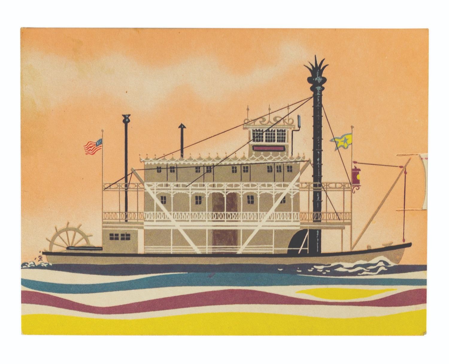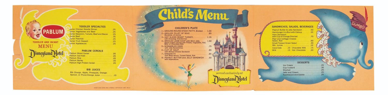 (Disneyland Hotel, 1957) An early Disneyland Hotel children's menu. The tri-fold cardstock menu features stylized artwork of the Mark Twain Riverboat on the front cover and opens to reveal three Fantasyland-themed pages of kid-friendly fare for toddlers and children. The reverse of the menu is a postcard blank, and the booklet can be sealed for mailing via a tab on the cover. Measuring 5"x7", the menu is in very good condition with only minor edge wear and handling.