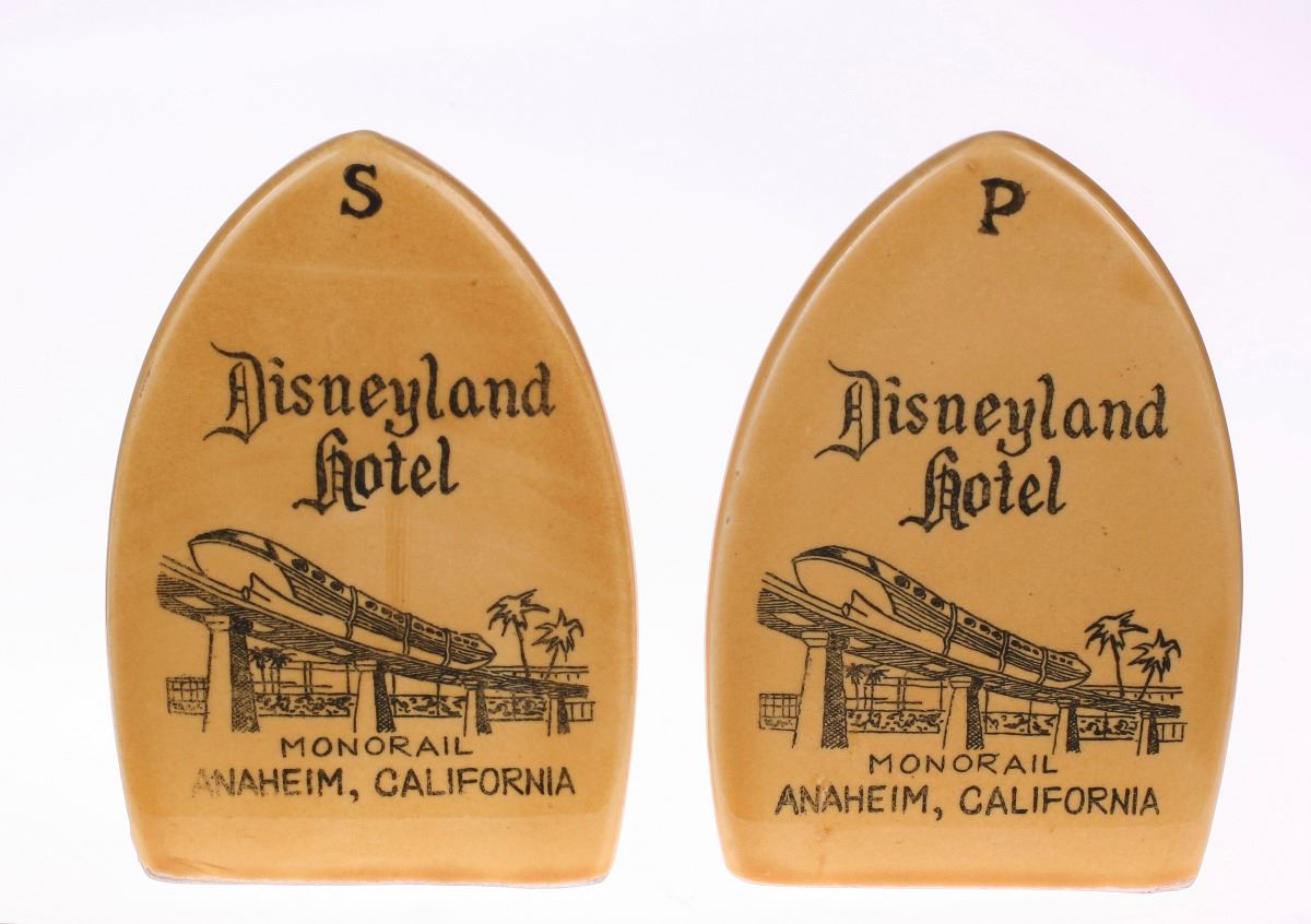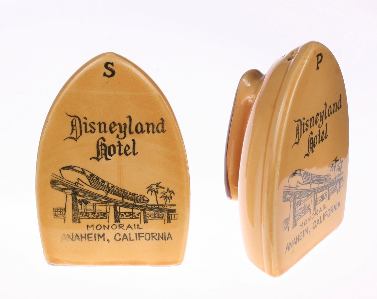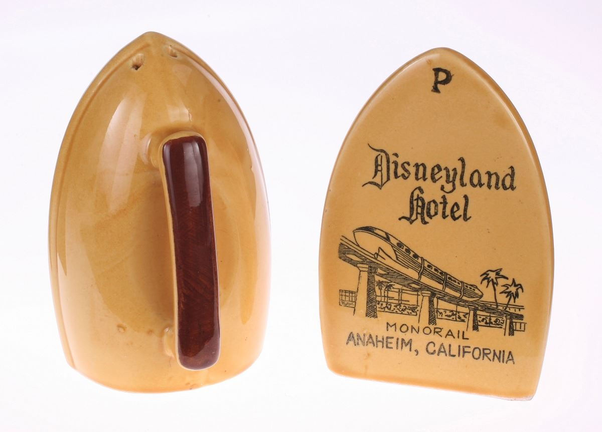 (Disneyland, 1960s) Ceramic pair of clothes iron-shaped salt and pepper shakers with "Disneyland Hotel" written above a great image of the monorail. Measures 2.5"x1.5" and 3.75" tall, each. In good condition with minimal wear.