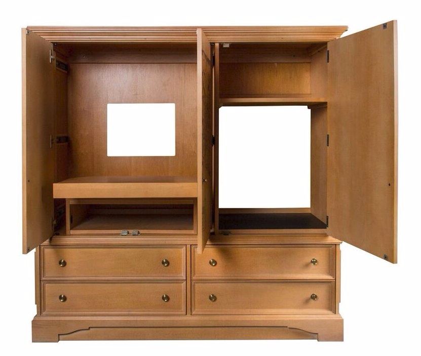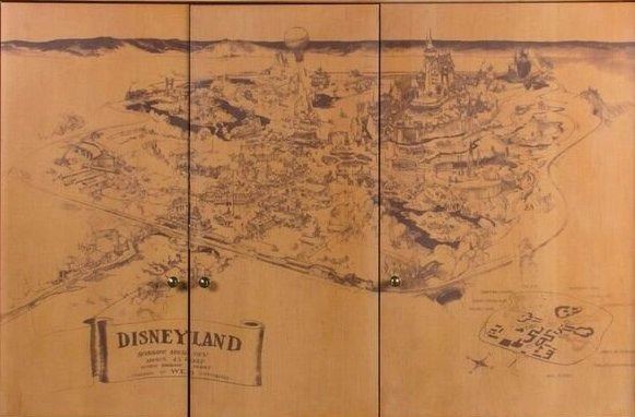 (Disneyland, c.2001) An impressive entertainment center from the Disneyland Hotel featuring imagery on the front of the original concept drawing by Imagineer Herb Ryman that Walt and Roy Disney used to secure financing for Disneyland in 1953. The large map imagery covers the three doors on the front side of the entertainment center. The two doors on the left would house the television and can withdraw into the cabinet for better viewing. The right door would house a mini refrigerator, but has enough space for additional storage uses as well. The bottom of the cabinet features four large pull-out drawers. This large entertainment center cabinet measures 61"x25" and 63" tall. This item is in very good condition with minor wear to the back, and is a fantastic functional piece of Disneyland history.