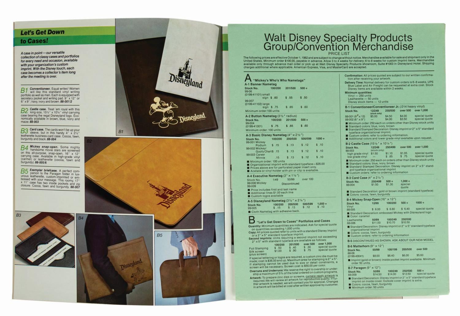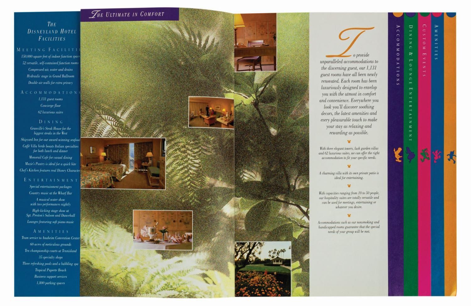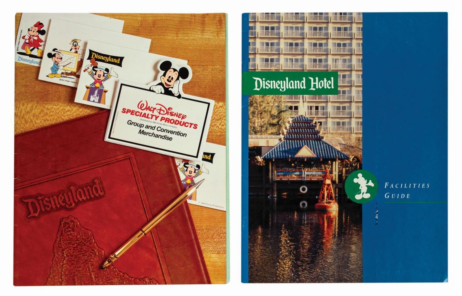 (Disneyland Hotel, 1982/1990s) A facilities guide for the Disneyland Hotel that promotes the space for large events. Covering accommodations, dining & lounge entertainment, custom events, and more, the 14-page guide showcases the hotel in the period between Disney's purchase of the property and the renovations for Downtown Disney. Also included is a 9-page catalogue and order form from 1982 for group/convention merchandise. Measuring 11"x8.5", the guide and catalogue are in very good condition with some bending along the spine and minor edge-wear from handling. There is some ink transfer on the front cover of the guide near the image of Mickey.