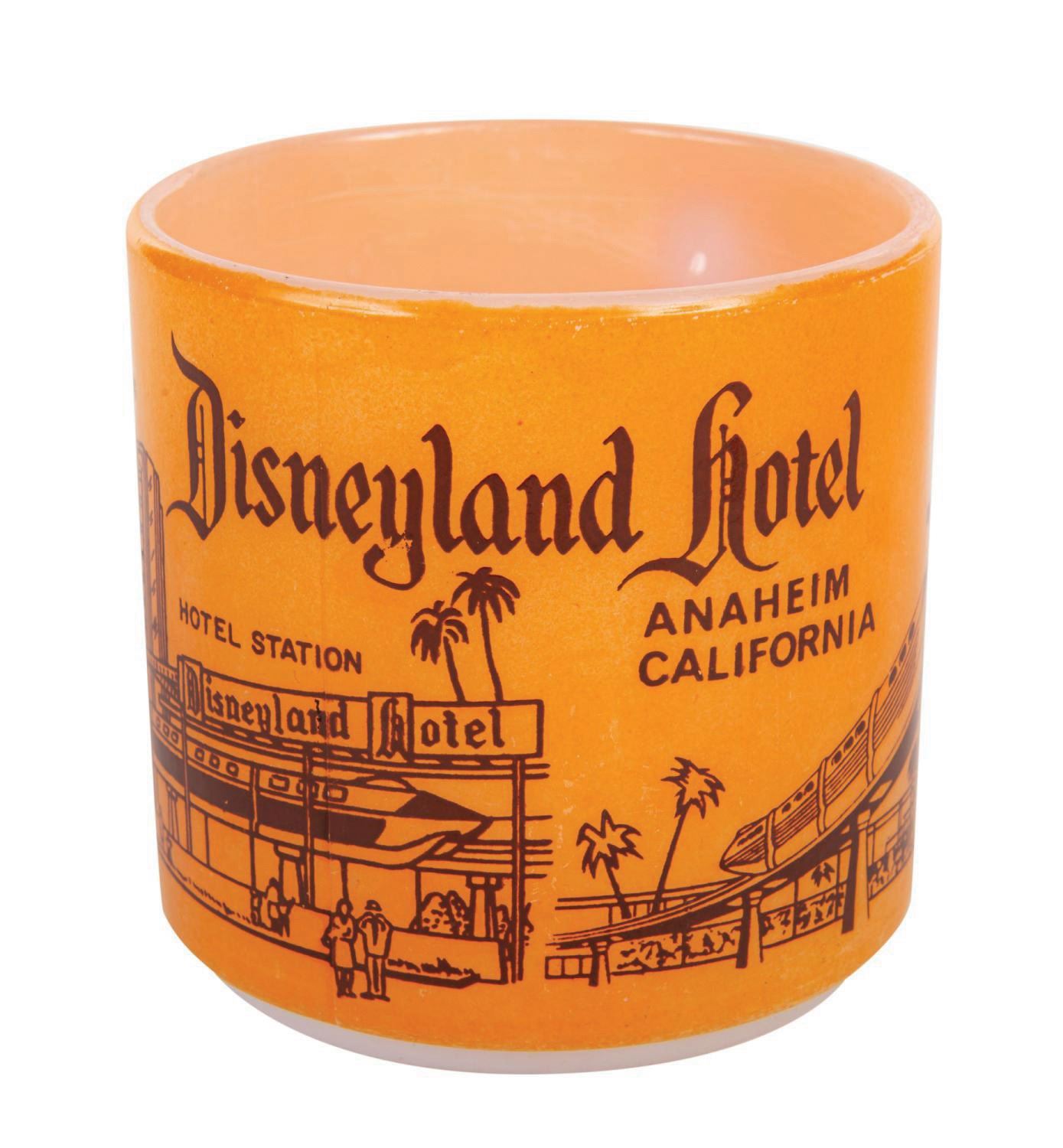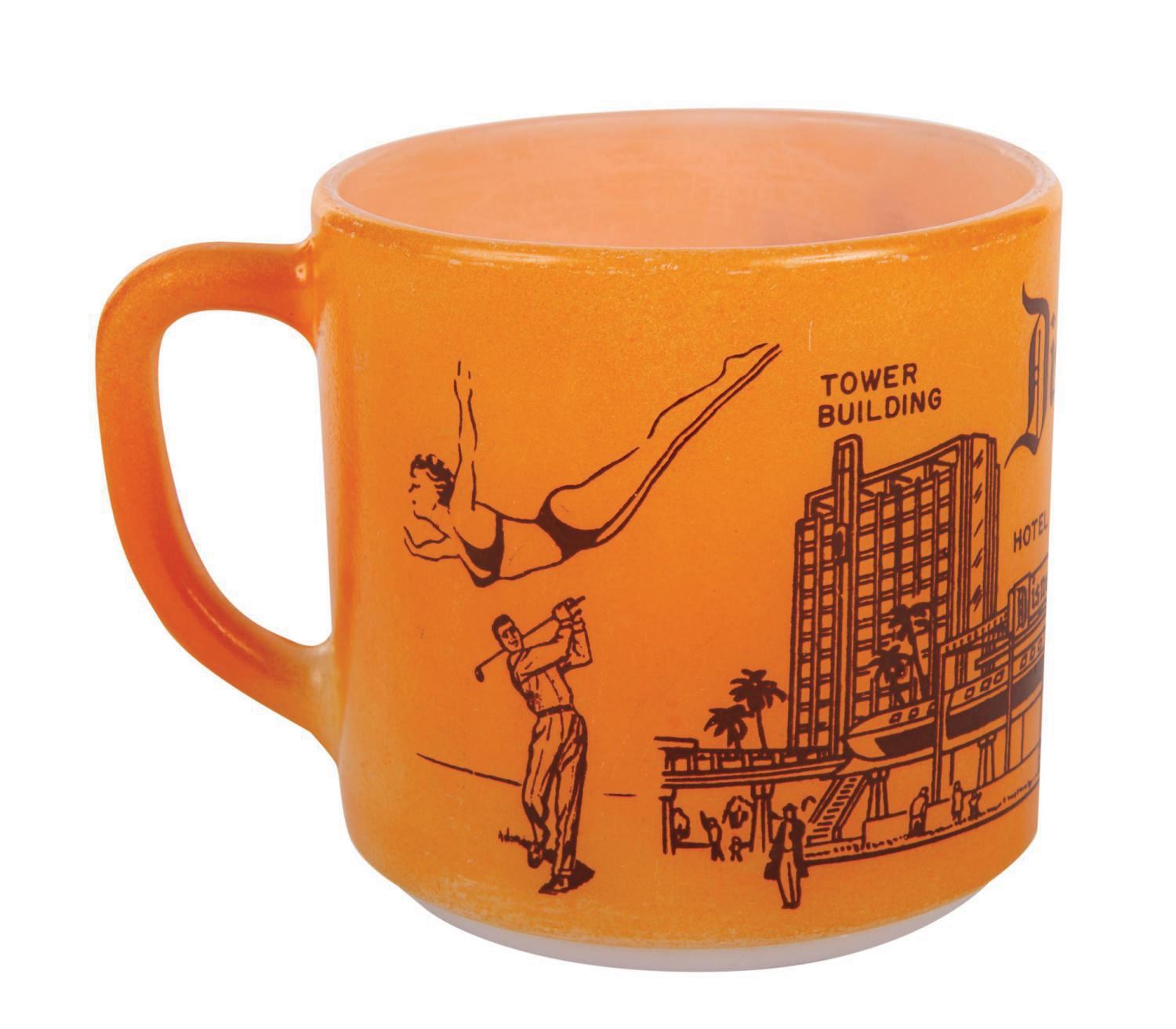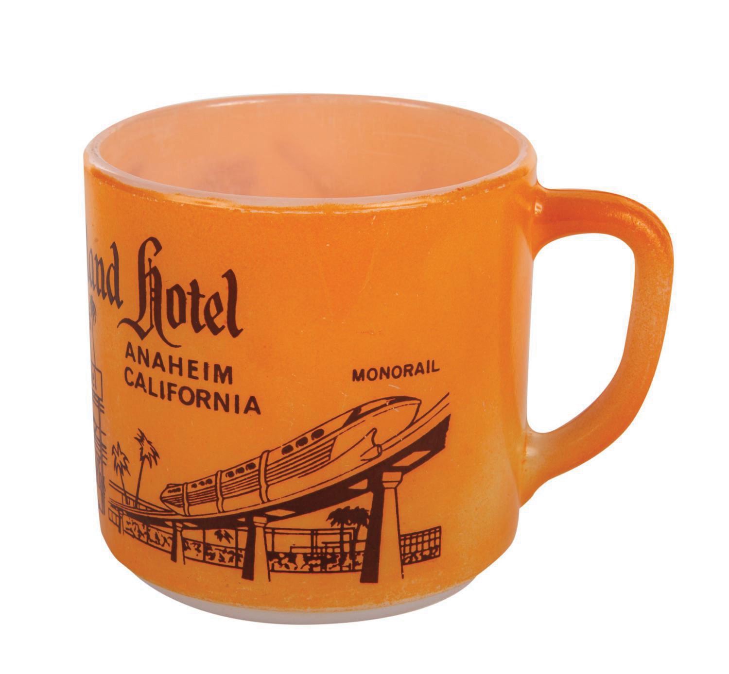 (Disneyland, 1960s) A Disneyland Hotel glass coffee cup by Federal Glass. The durable mug features painted imagery of the original Disneyland Hotel "Tower Building," a four-car Monorail train, an Olympic diver and golfer over white glass. Measuring 4" tall and 3" in diameter, the mug is in fine condition with little wear.