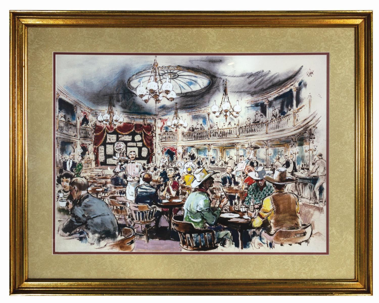 (Disneyland Hotel, c.2000s) A framed print of Imagineer Sam McKim's concept art for Slue-Foot Sue's Golden Horseshoe Saloon in Disneyland. Artwork from the history of the park is a fixture of the Disneyland Hotel's decor, and this framed print was on display at the legendary establishment for many years. Measuring 20"x26.75" visible through a 28.25"x35.25" gold tone wood frame, the piece is in very good condition with some surface wear and paint loss to the frame.