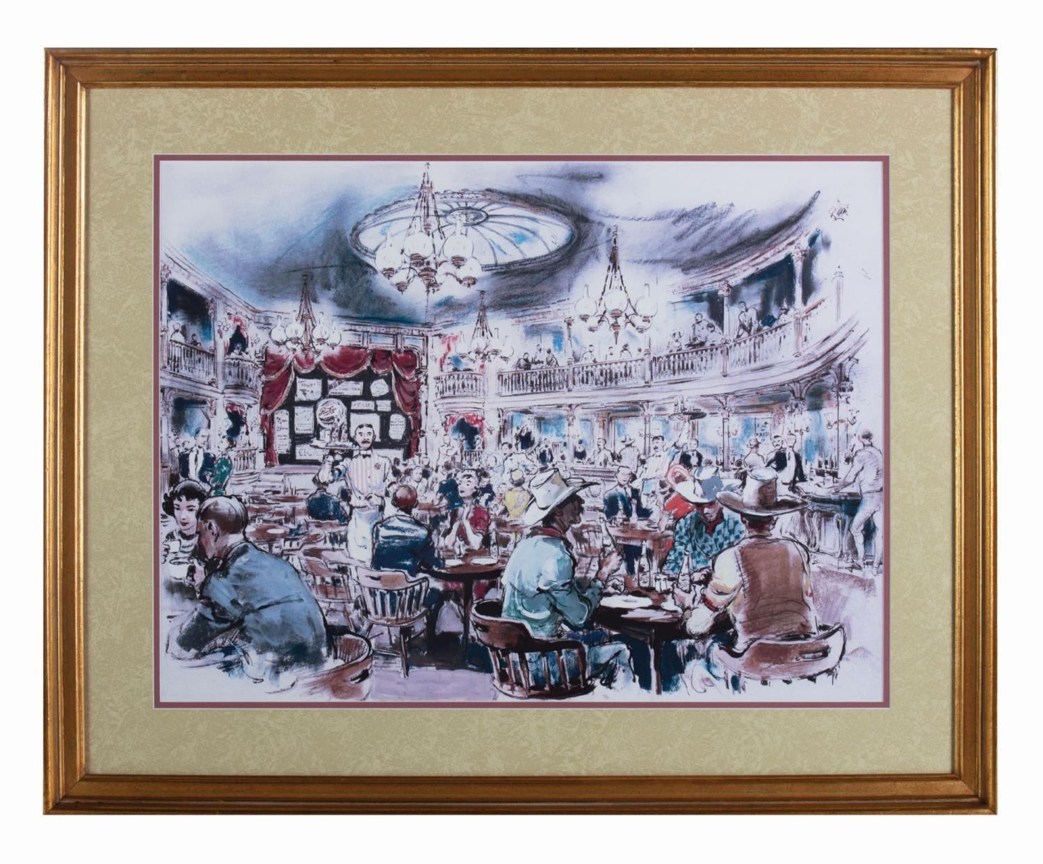 (Disneyland Hotel, c.2000s) A framed print of Sam McKim's envisioning of Slue-Foot Sue's Golden Horseshoe Saloon at Disneyland. The exhibition of framed prints of conceptual artwork is an ongoing decorative feature of offices and guest suites of Disneyland Park and Disneyland Resort. The imagery of "the longest little bar" measures 20"x26.75", visible through a 28.25"x35.25" gold-tone wood frame. The piece is in very good condition with some surface wear and minor paint loss to the frame.