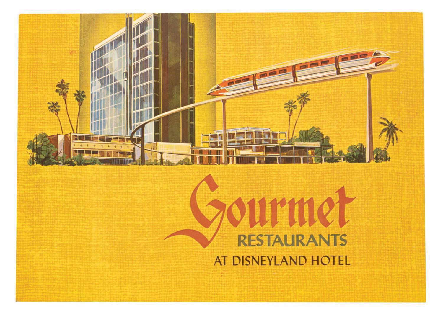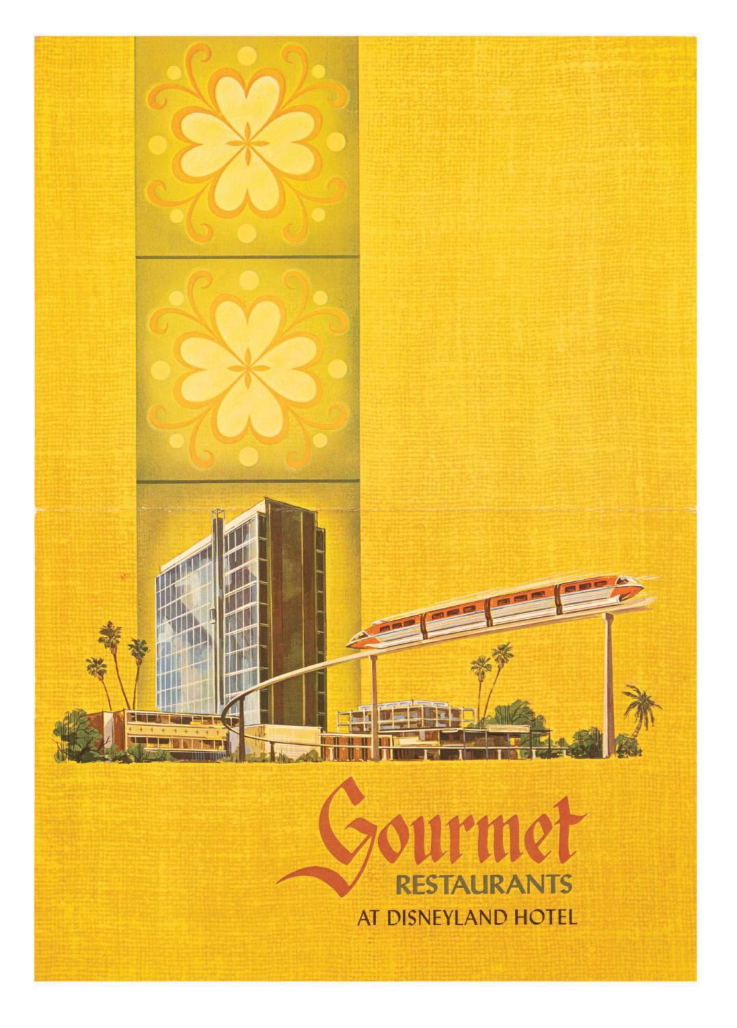 (Disneyland Hotel, 1968) A Gourmet Restaurants at the Disneyland Hotel menu. The Gourmet Restaurants opened in 1956, operating until it was replaced by the Monorail Cafe in 1986. The front of the menu features imagery of a four-car Monorail Red Mark 2 arriving at the Disneyland Hotel's North Sierra Tower. Measuring 15"x10.5", the menu displays in very good condition, exhibiting few creases and minor wear to edges and corners.