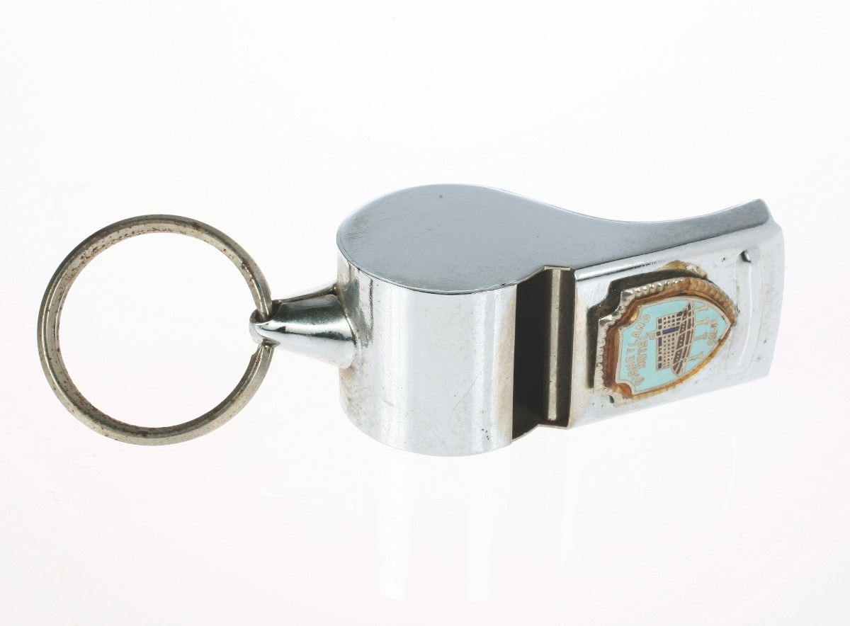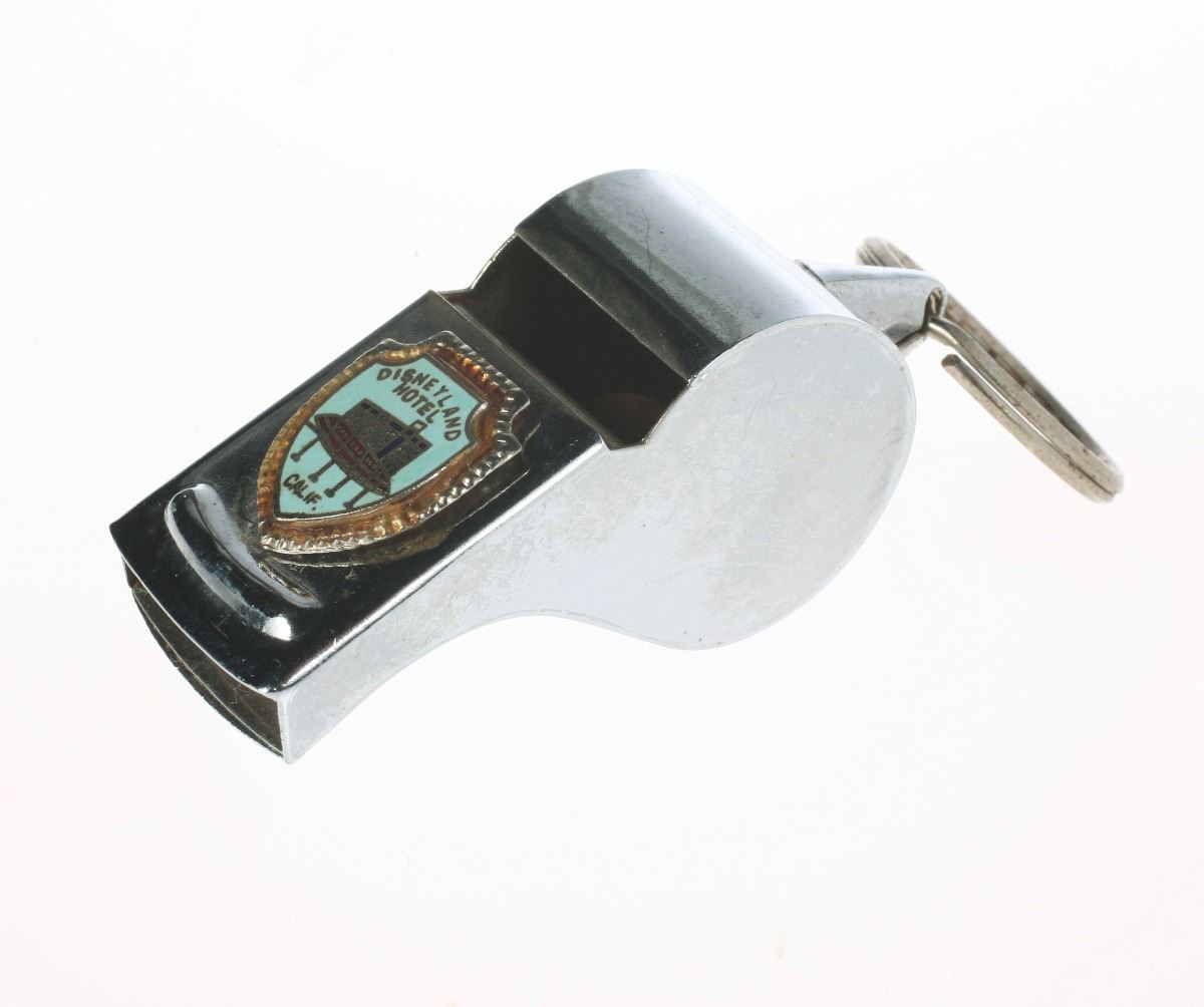 (Disneyland, 1960s) Metal key ring whistle with Disneyland Hotel crest on the surface. Measures 2.25"x1"x1". In good condition with minor wear.