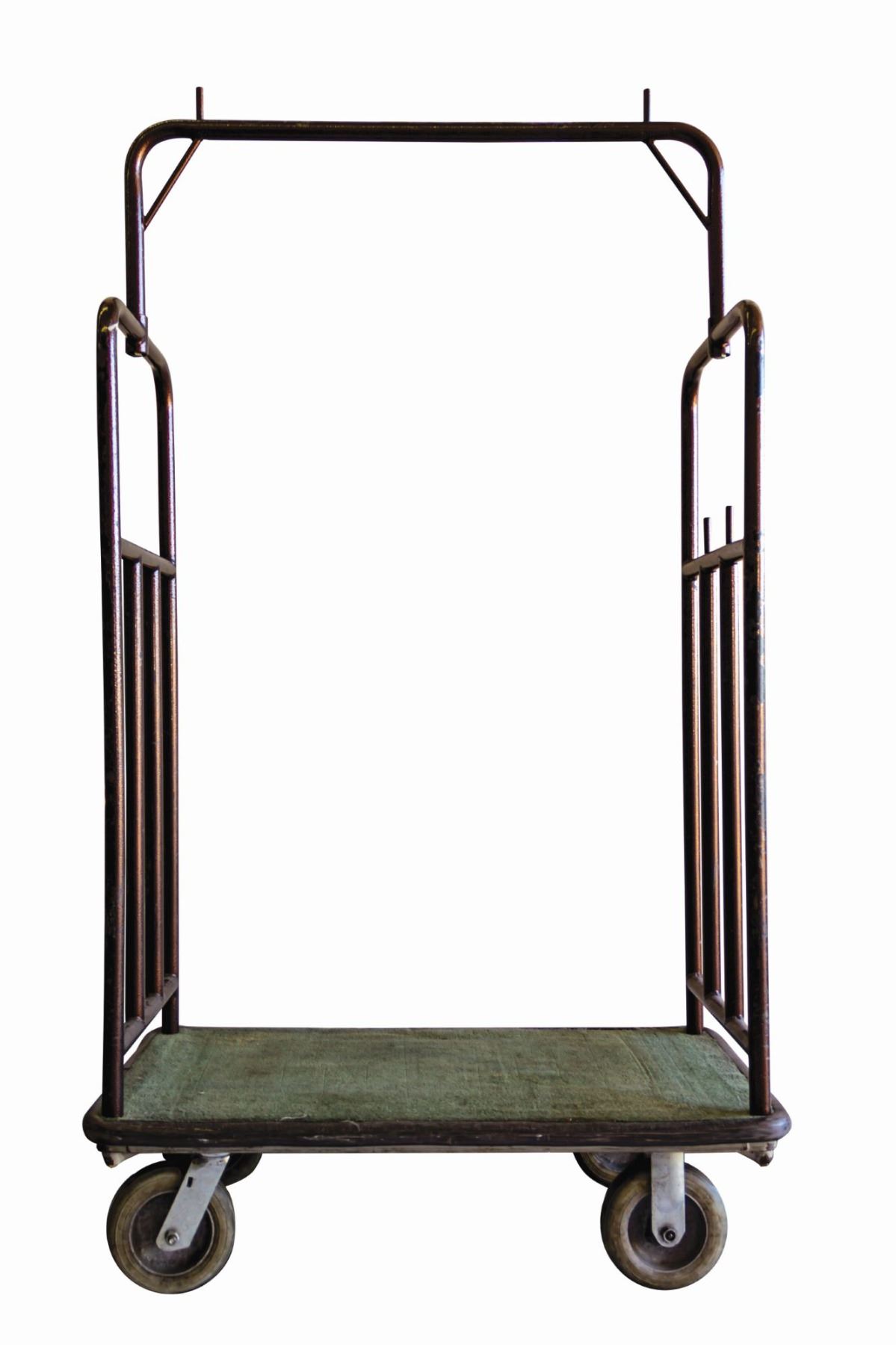 (Disneyland Hotel, 2000s) A very rare original luggage cart from the Disneyland Hotel. Functional pieces of the Disneyland Hotel such as this are incredibly rare, with this luggage cart standing just over 73" tall. The base platform measures 23"x42", and the cart is in fair to good with wear from use, including some worn areas of the finish on the metal bars. This item will require special shipping arrangements. Please contact us for details and estimates.