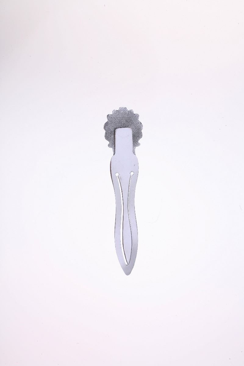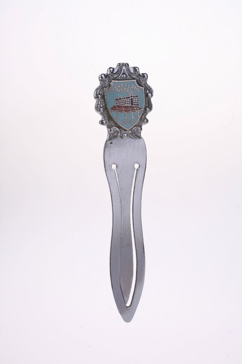 (Disneyland, 1950s) Silver-tone book marker with a Disneyland Hotel crest on top. Measures 3.25"x0.75". In good condition.