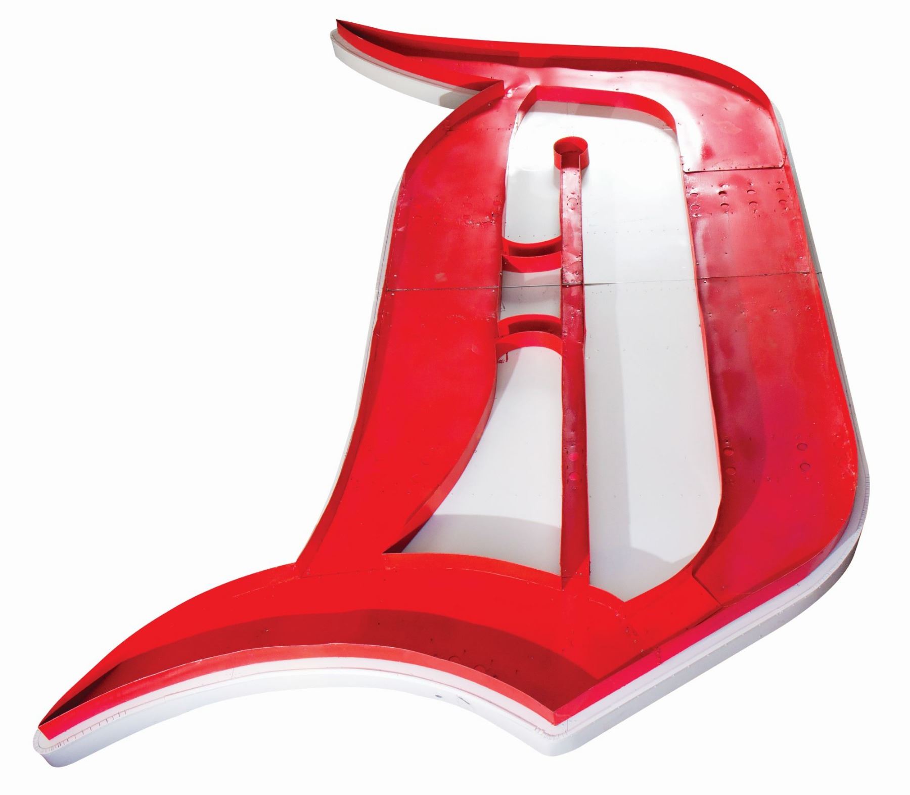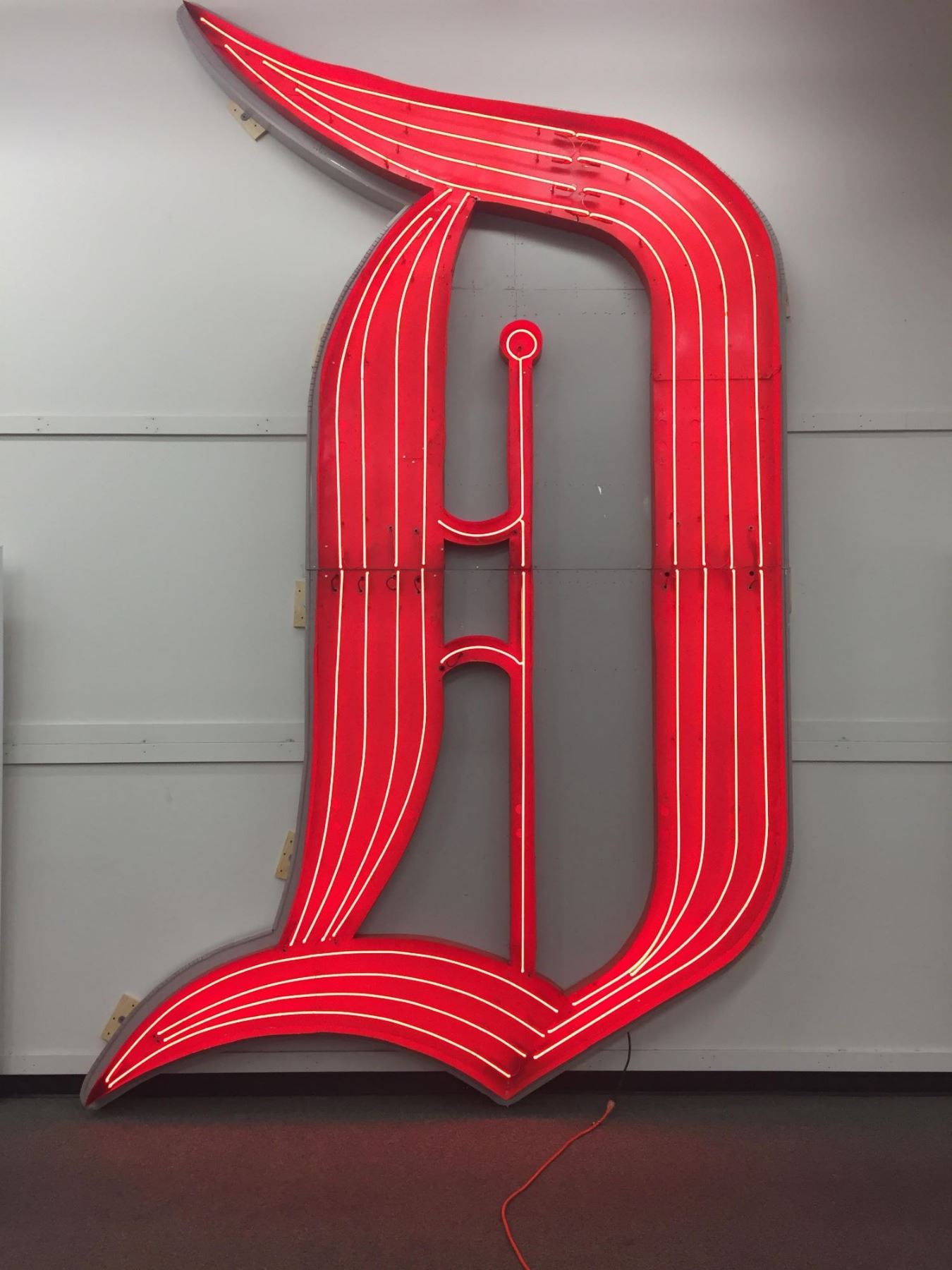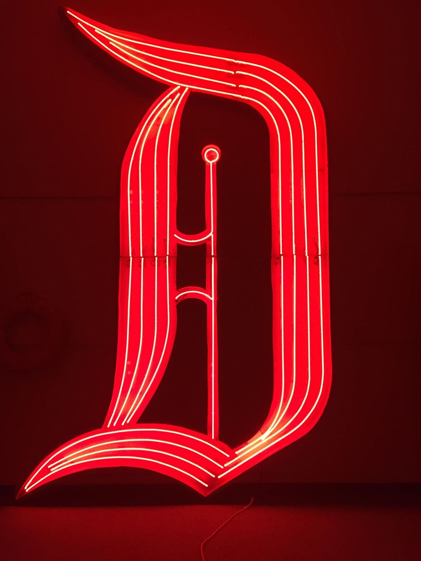 (Disneyland, 1963) An incredible neon "D" which was prominently displayed over the Disneyland Hotel's "Tower Building" which would later be renamed the "Sierra" tower. From 1963 until 1999, this large neon "D" was displayed over the Disneyland Hotel and was visible by countless Disneyland guests as they exited the park at night. The Tower Building was constructed in 1962, and the "Disneyland Hotel" red neon letters were added in 1963. The Tower Building featured a glass elevator on the exterior that caused spacing issues for the neon sign. As such, this sign read "Hotel Disneyland" until the building expanded in 1966 and the words could be arranged to the correct "Disneyland Hotel" position. This neon "D" is one of the most iconic elements from the golden age of the Disneyland Hotel, and also serves as an early Disneyland landmark. This neon letter is constructed in its original metal frame, and has had its red neon professionally restored to working condition. This incredible artifact measures approximately 16ft tall, 9ft wide, and 4in deep. The condition is very good, with some expected wear to the frame during the sign's removal from the hotel. Special shipping arrangements will apply. Please inquire before bidding.
