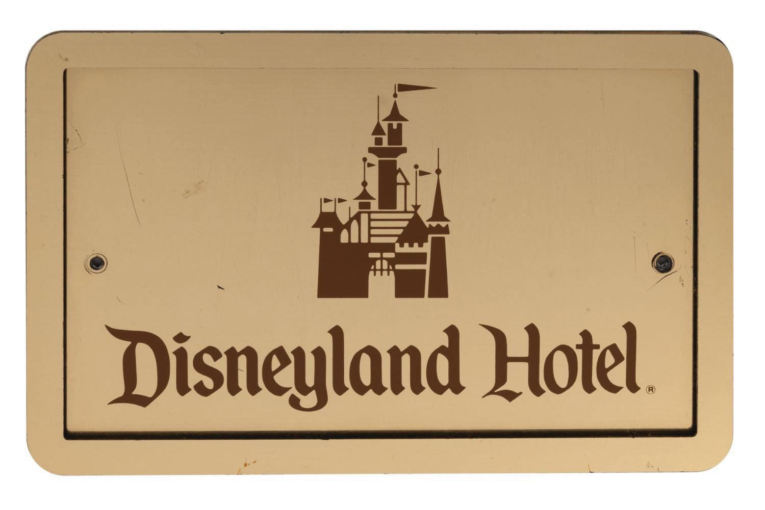 (Disneyland Hotel, c.1970s-80s) A Disneyland Hotel Plaque once utilized at the Disneyland Hotel, featuring the Hotel name and Sleeping Beauty Castle emblem on a glassy gold-toned front. Measuring 6"x9.25", the shiny acrylic plaque is in good condition, exhibiting some scuffs and scratches typical of displayed signage.