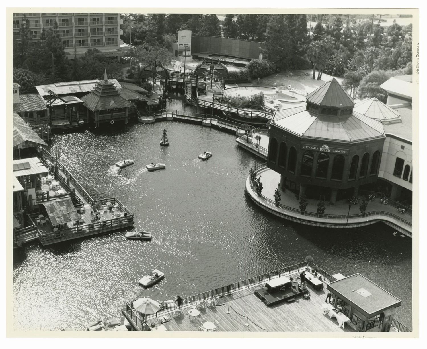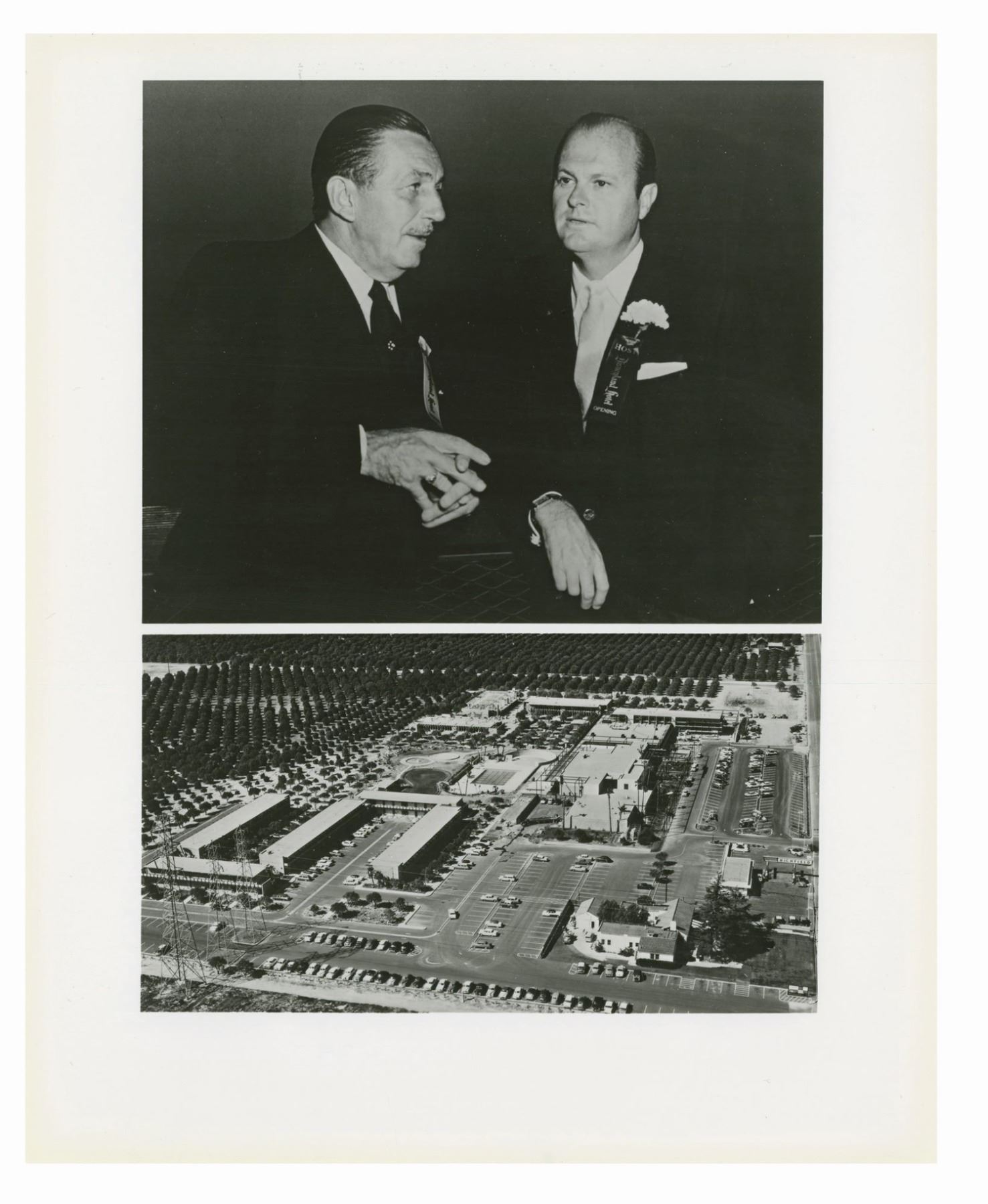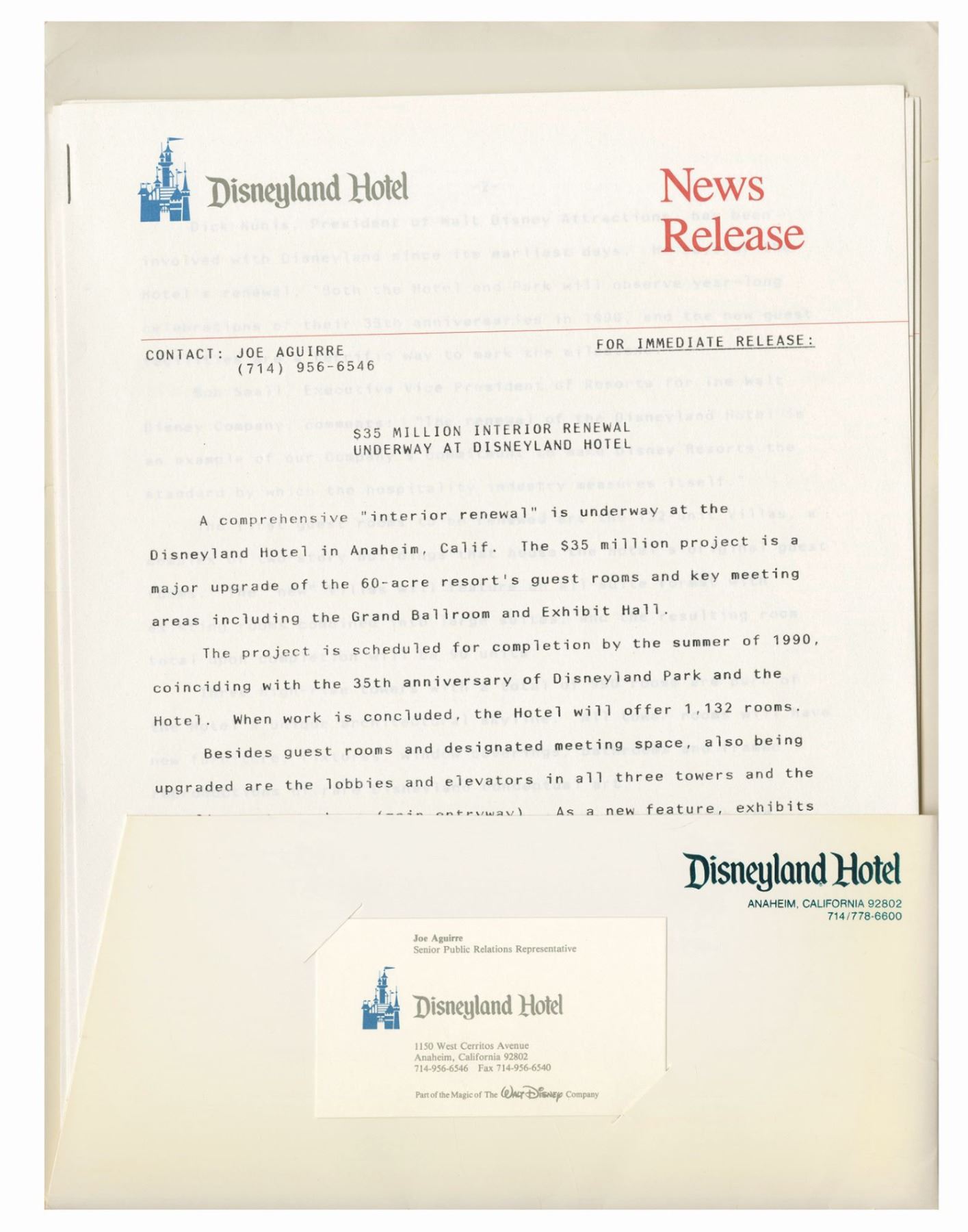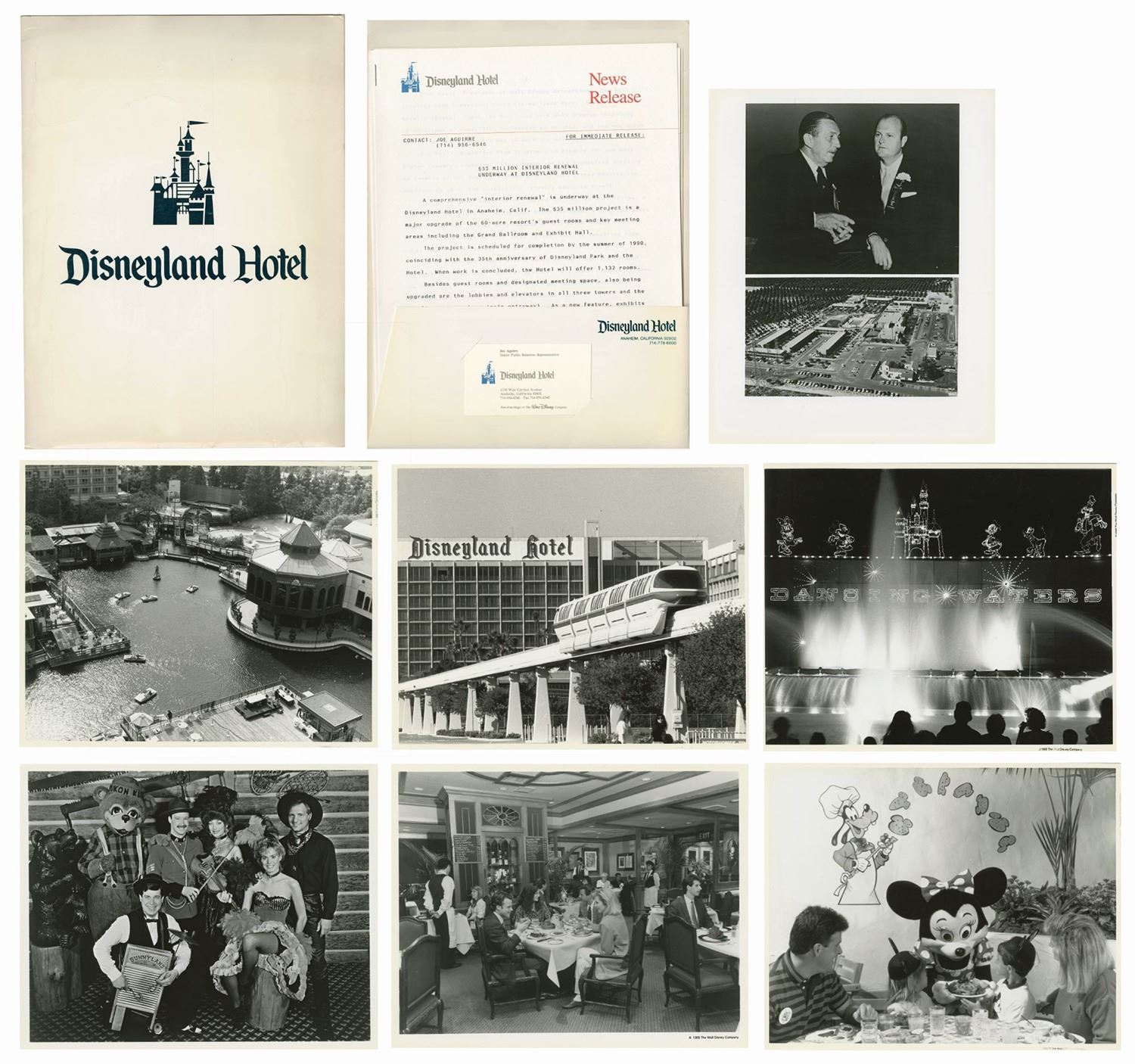 (Disneyland Hotel, 1989) A rare press packet for the Disneyland Hotel. The packet contains (6) press stories relating to the hotel, its $35 million renovation, and the 35th anniversary in 1990. Also included are (7) black and white photos of the hotel, both contemporary and early in its history. The packet measures 12"x9" and is in good condition with some cover wear from use.