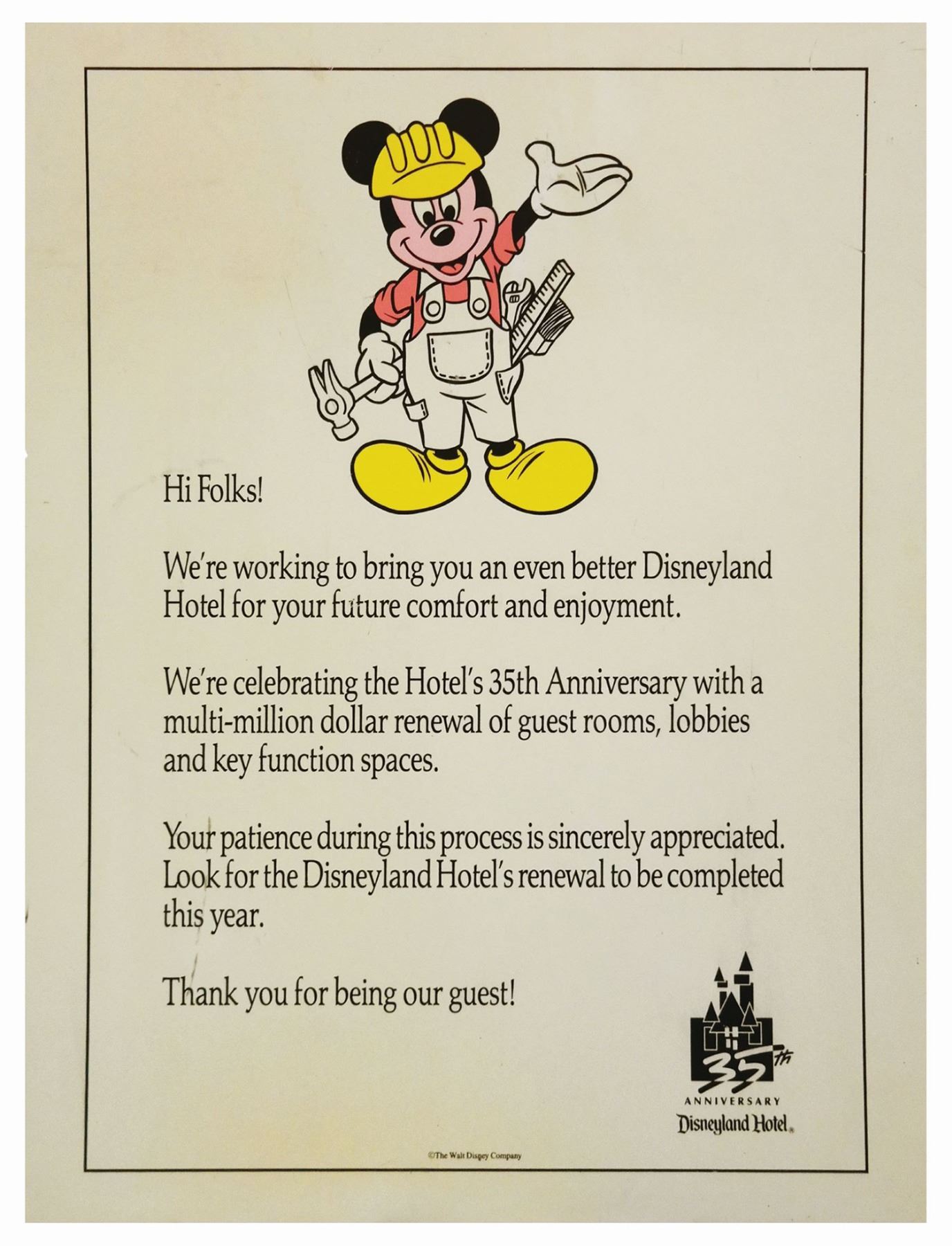 (Disneyland Hotel, 1990) A rare sign used at the Disneyland Hotel during the Hotel's 35th anniversary. The anniversary coincided with a large multi-million dollar refurbishment to the guest rooms, lobbies, and additional areas. The sign, depicting a construction worker Mickey, was printed on acrylic board and measures 28"x22". The condition is good, with a few small chips around the edges and a few surface scratches from use.