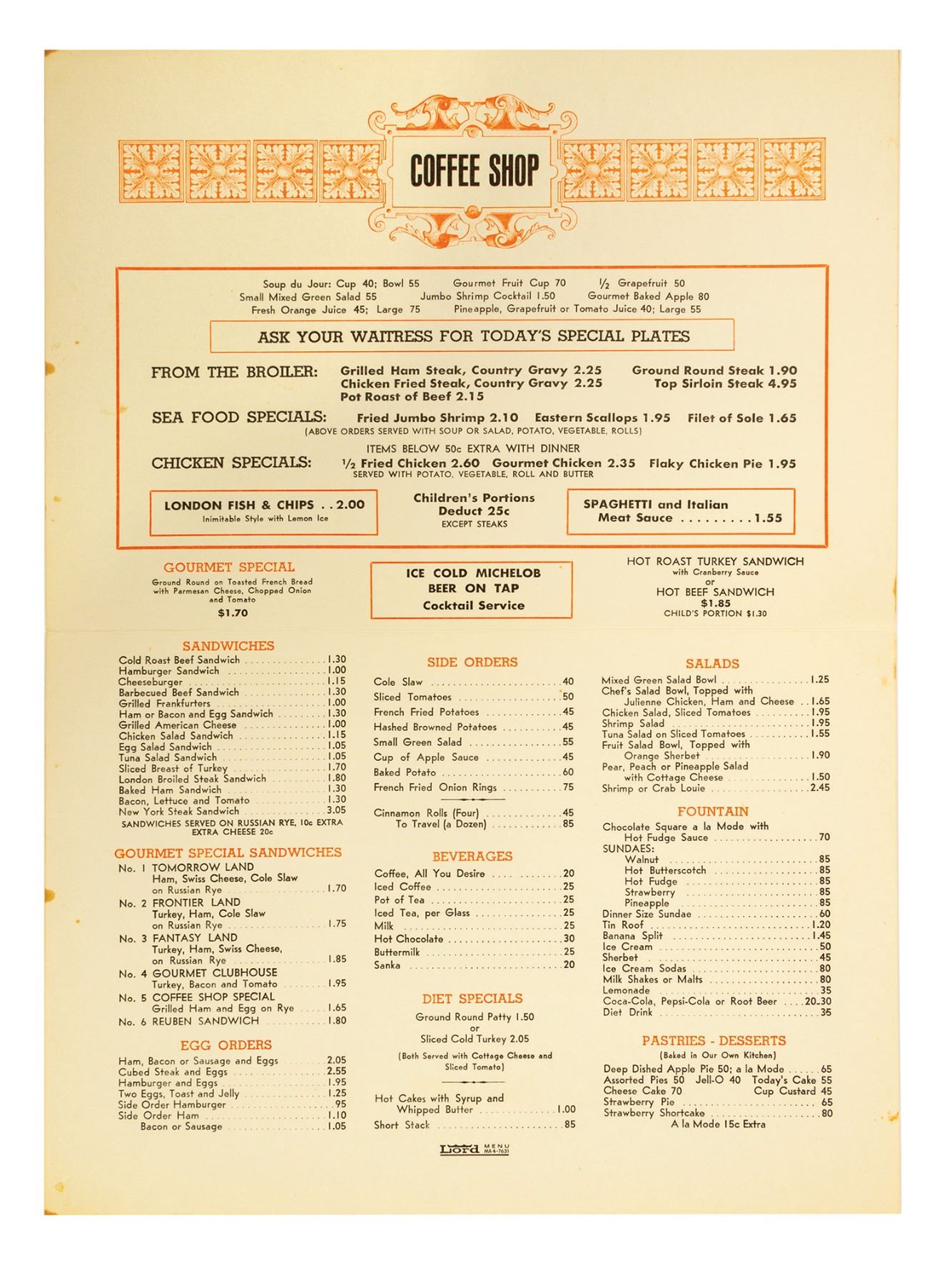 (Disneyland Hotel, 1966) An original menu from the Disneyland Hotel Restaurant by Gourmet. The front of the menu features imagery of the hotel and the Monorail, while the reverse lists the lunch options available. Measuring 15"x10.5", the menu is in good condition with a horizontal fold through the center and some edge-discoloration to the reverse.